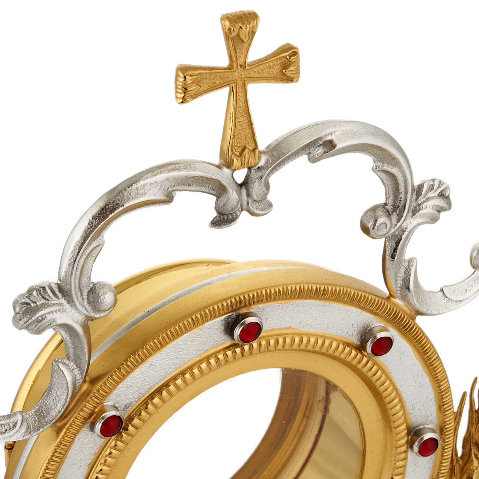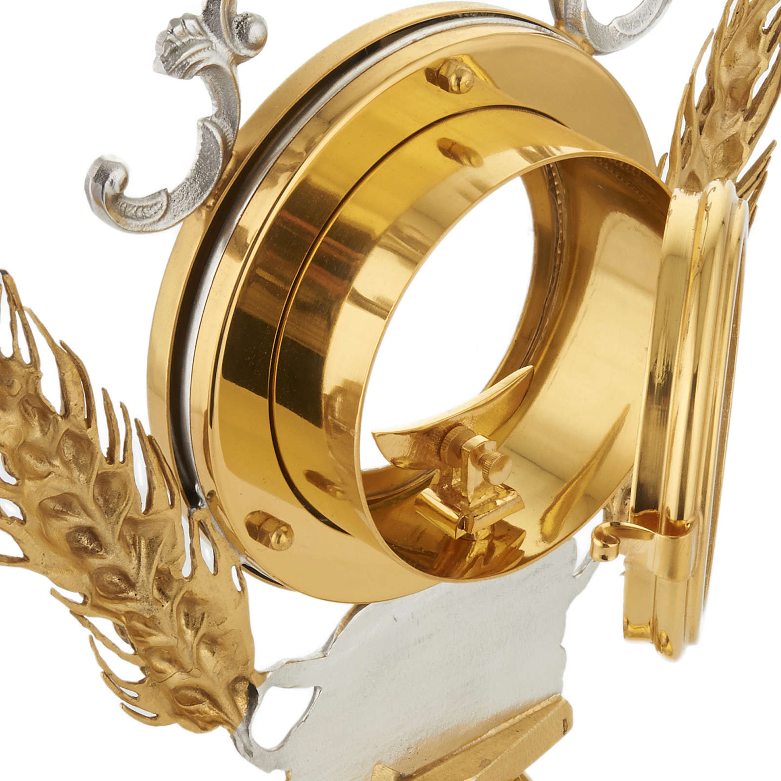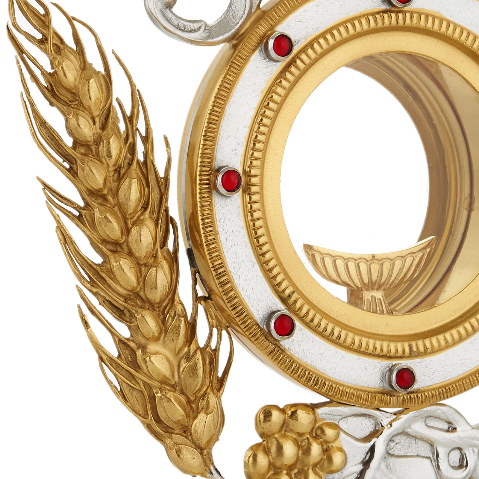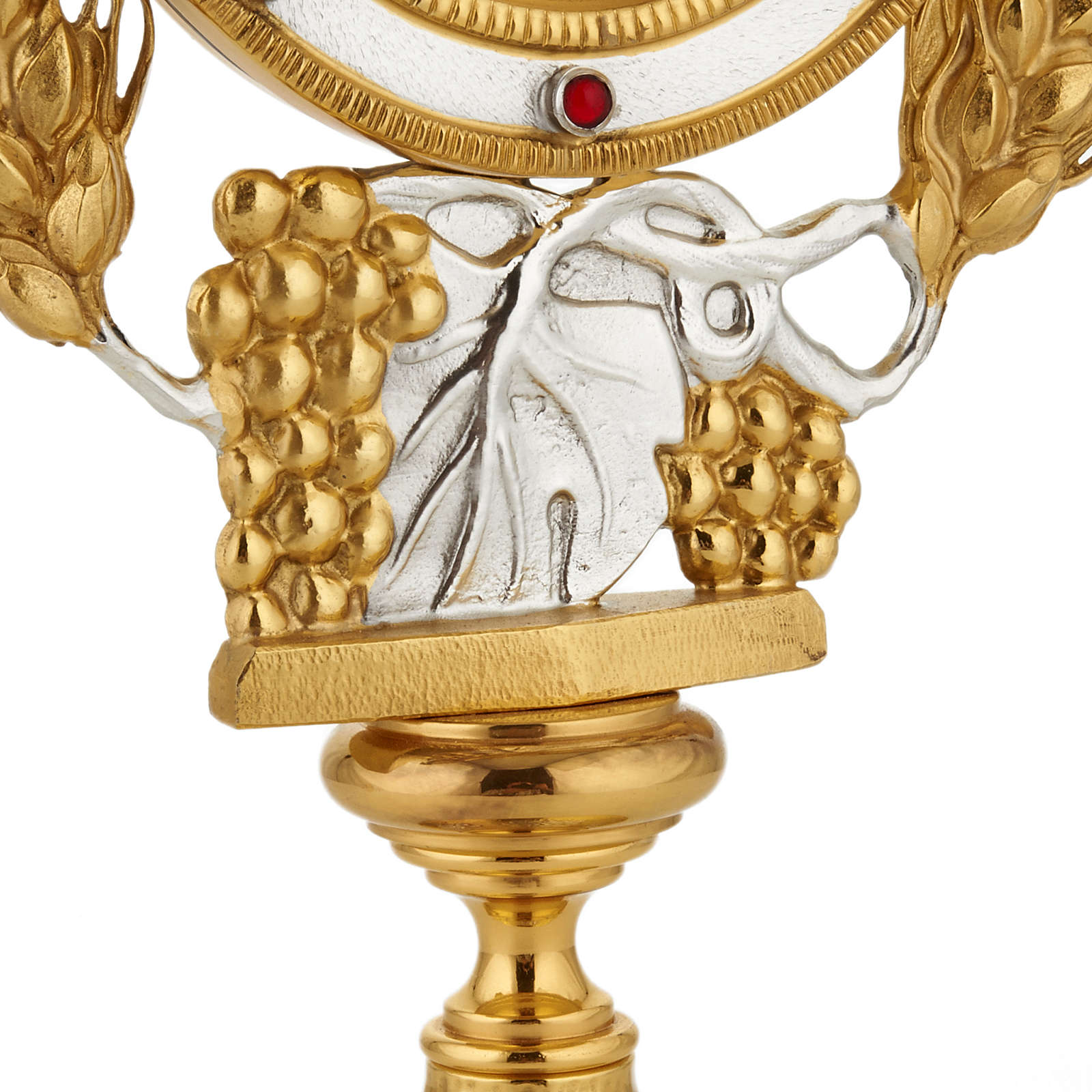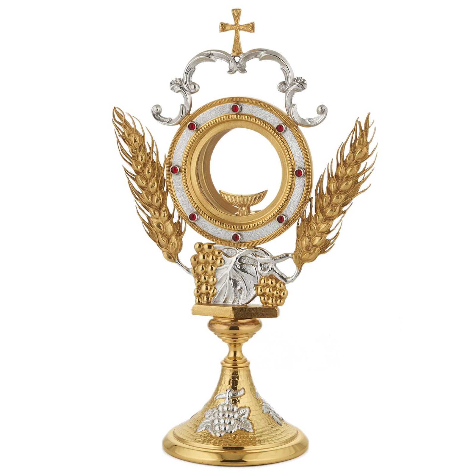Ostensoir précieux en bronze argenté et doré, épis et raisins autour du coffret eucharistique. Décoré avec épis et raisins autour du cadre pour l'hostie. L'ostensoir est réalisé de manière artisanale dans une entreprise connue dans le domaine de la fabrication de matériel religieux.