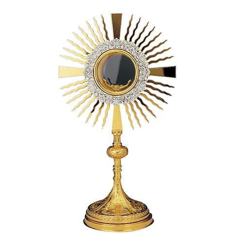 Ostensoir laiton doré et argenté. Autour du verre des décors de flaurs. Ostensoir ciselé à la main, de 45 cm de hauteur. Produit réalisé à la main dans une entreprise italienne très connue dans le secteur et dans la tradition de décoration du métal pour matériel liturgique. La bonne qualité des matériaux, les dessins originaux et les phases artisanales de la réalisation ce sont des caractéristiques spéciales de cet article. Si vous souhaitez recevoir plus de renseignements appelez le 800 97 43 08 ou écrivez à servizioclienti@holyart.it