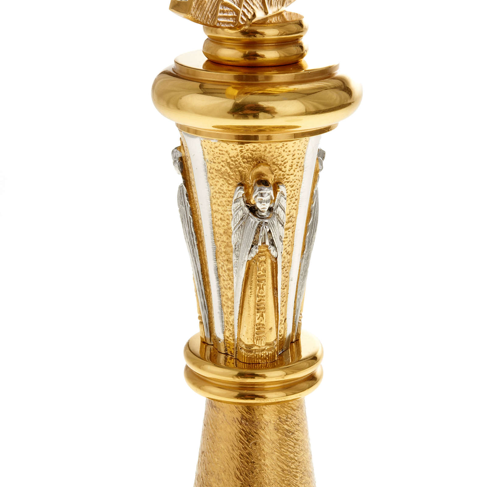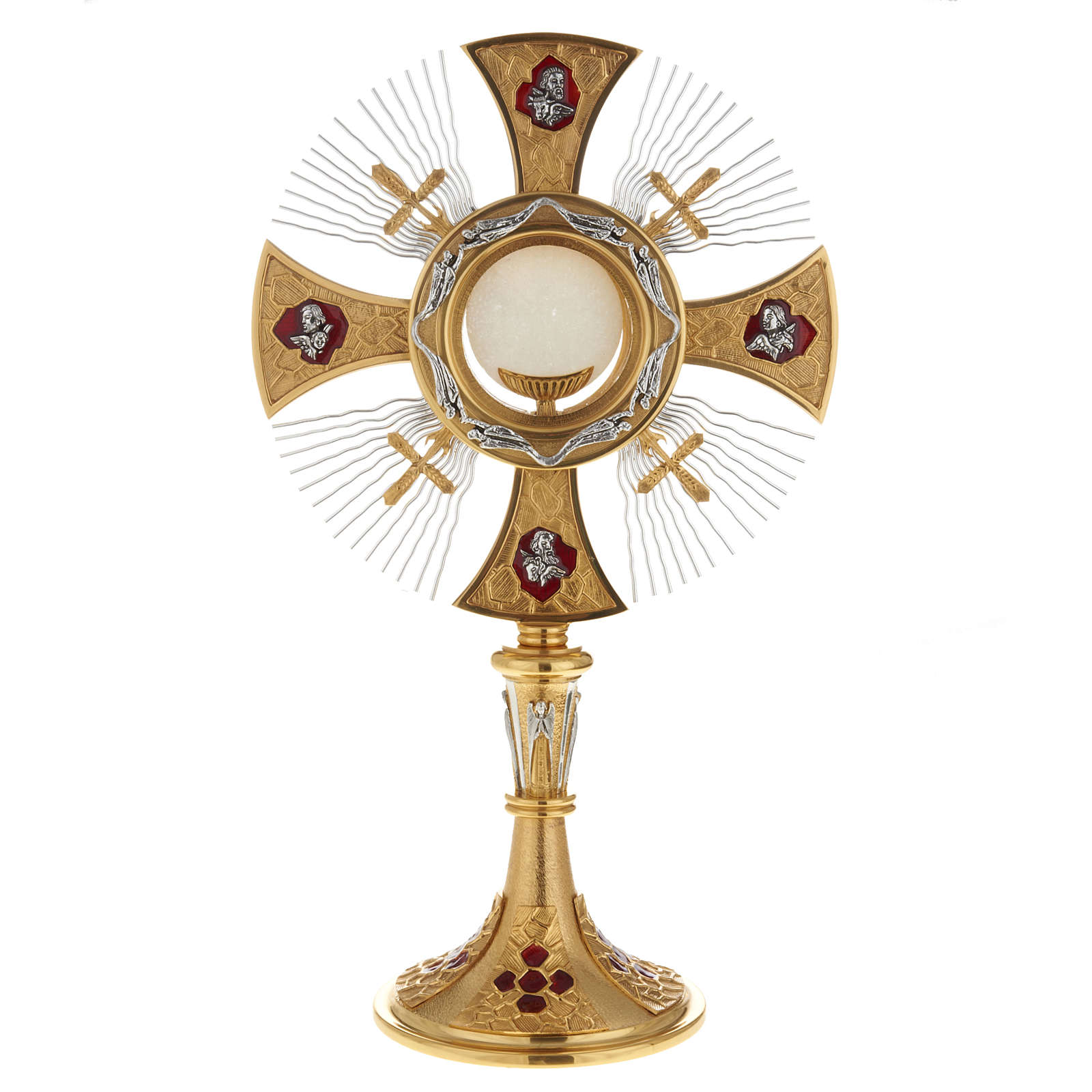 Ostensoir précieux en bronze argenté et doré, rayons et anges autour du coffret eucharistique. Décoré avec anges et rayons sur la base du cadre pour l'hostie. L'ostensoir est réalisé de manière artisanale dans une entreprise connue dans le domaine de la fabrication de matériel religieux.