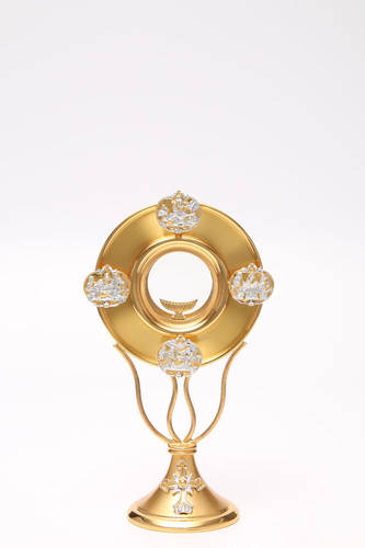 Ostensoir précieux, riche en détails pour exprimer grâce aux symboles la grandeur des mystères qui s'accomplissent. Ostensoir en bronze argenté avec scènes de la vie de Jésus. L'ostensoir est réalisé de manière artisanale dans une entreprise connue dans le domaine de la fabrication de matériel religieux.