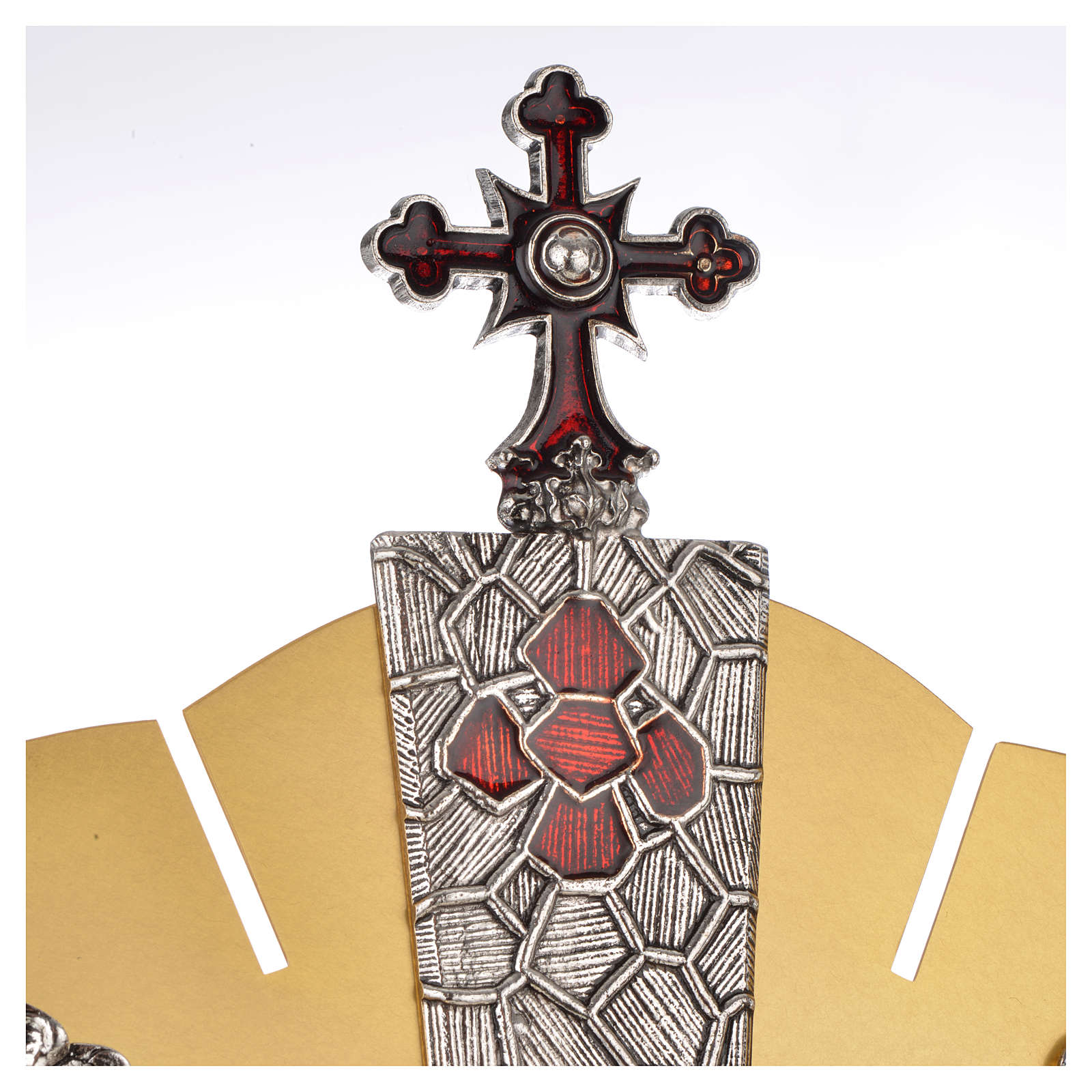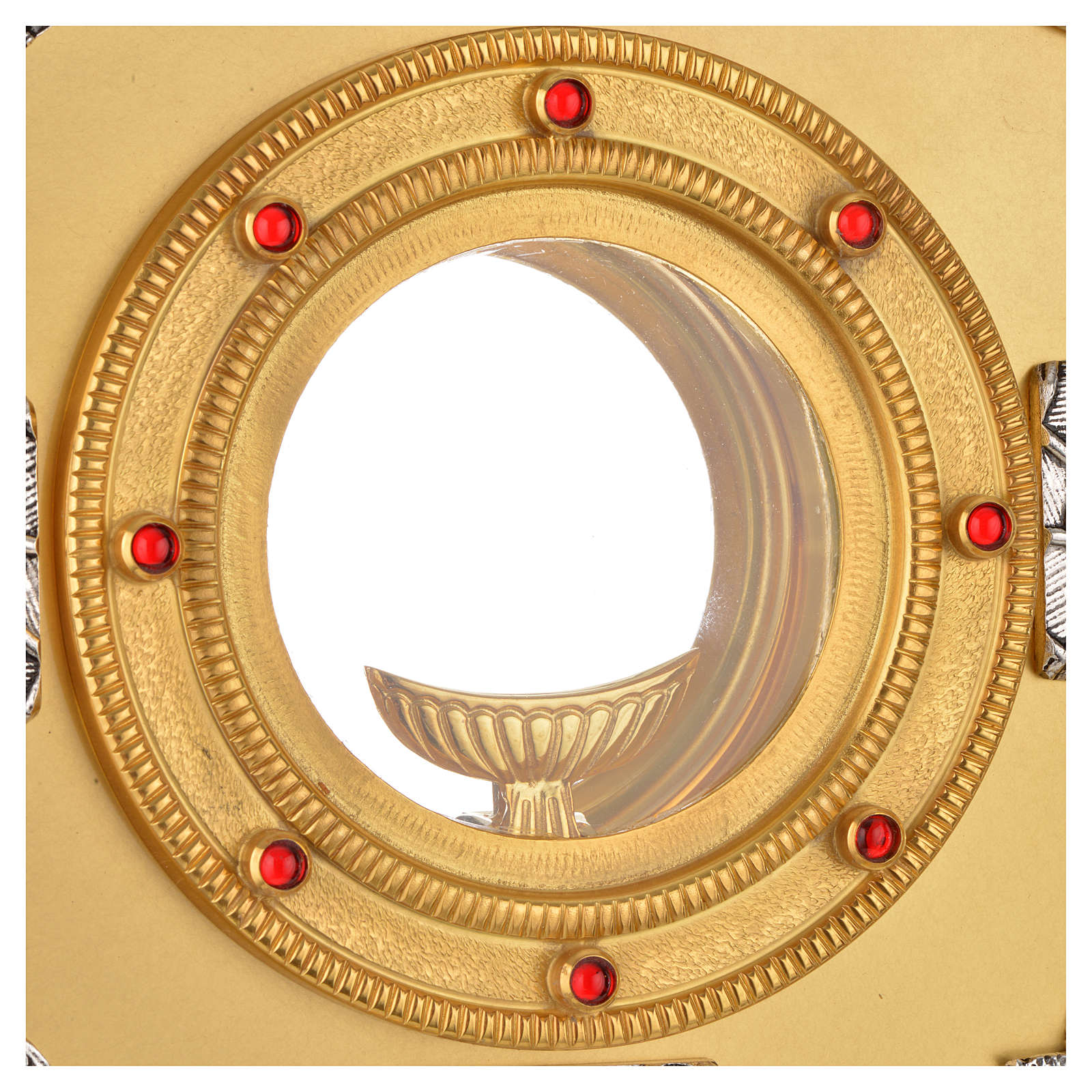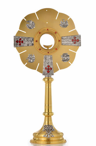 Ostensoir précieux, riche en détails pour exprimer grâce aux symboles la grandeur des mystères qui s'accomplissent. Ostensoir en bronze argenté avec les symboles des évangiles. L'ostensoir est réalisé de manière artisanale dans une entreprise connue dans le domaine de la fabrication de matériel religieux.