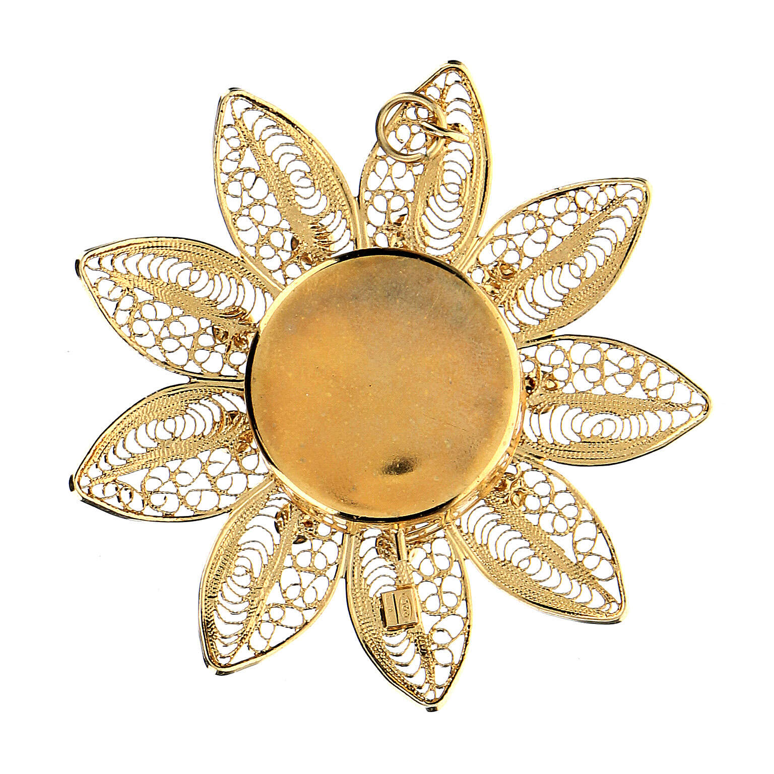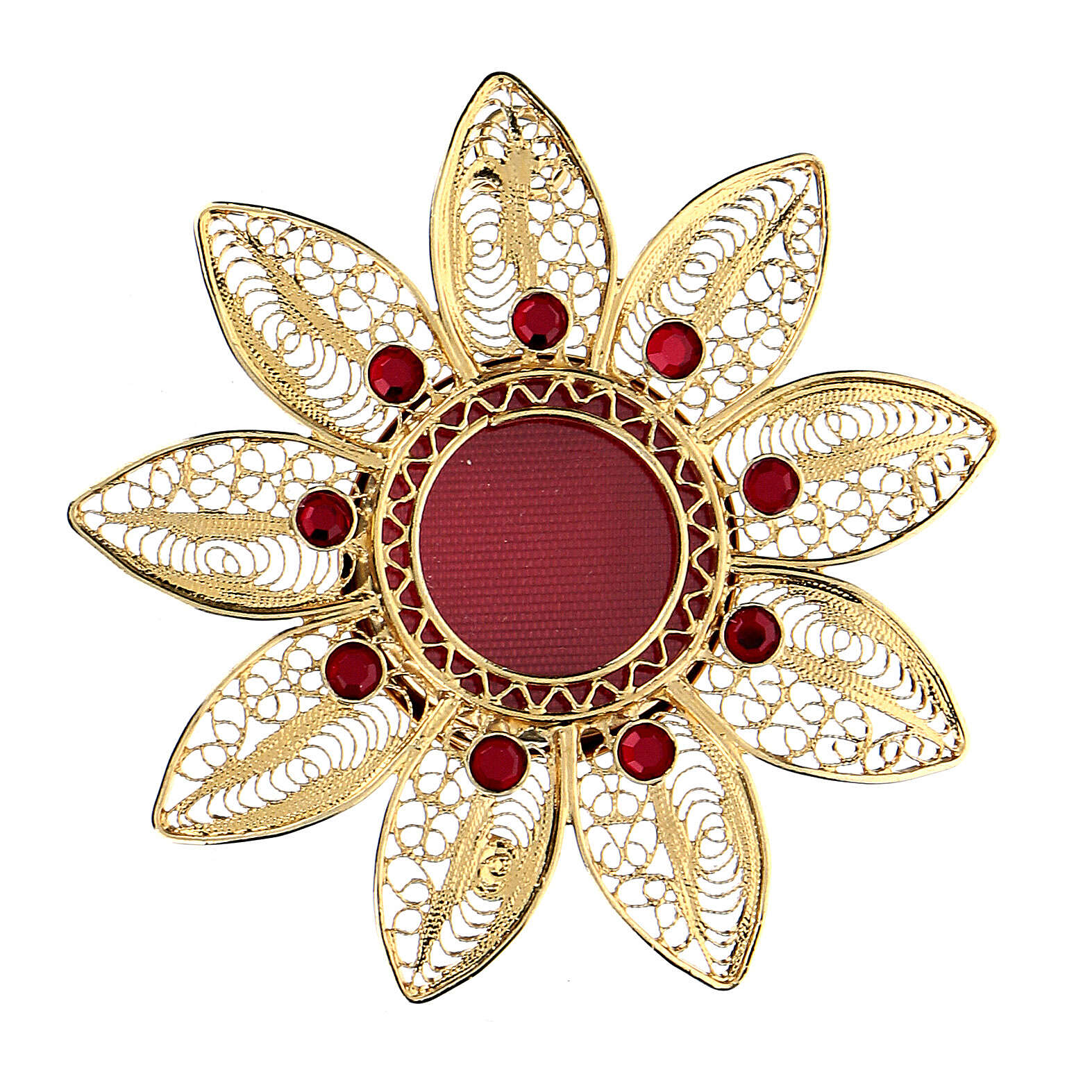 Reliquaire 5 cm forme de fleur argent doré pierres rouges. Reliquaire de petites dimensions, pouvant être utilisé comme pendentif, réalisé en argent 925 doré en forme de fleur avec des pierres rouges serties.Article produit en Italie par une entreprise avec une longue expérience dans la création d'objets en argent.Poids : 11 gr.