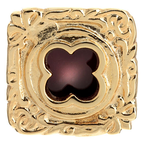 Reliquaire bord doré avec croix diam. 6 cm. Reliquaire de 6 cm de diamètre avec bord carré en laiton doré aux motifs baroques et lunule en forme de croix avec intérieur en tissu rouge.