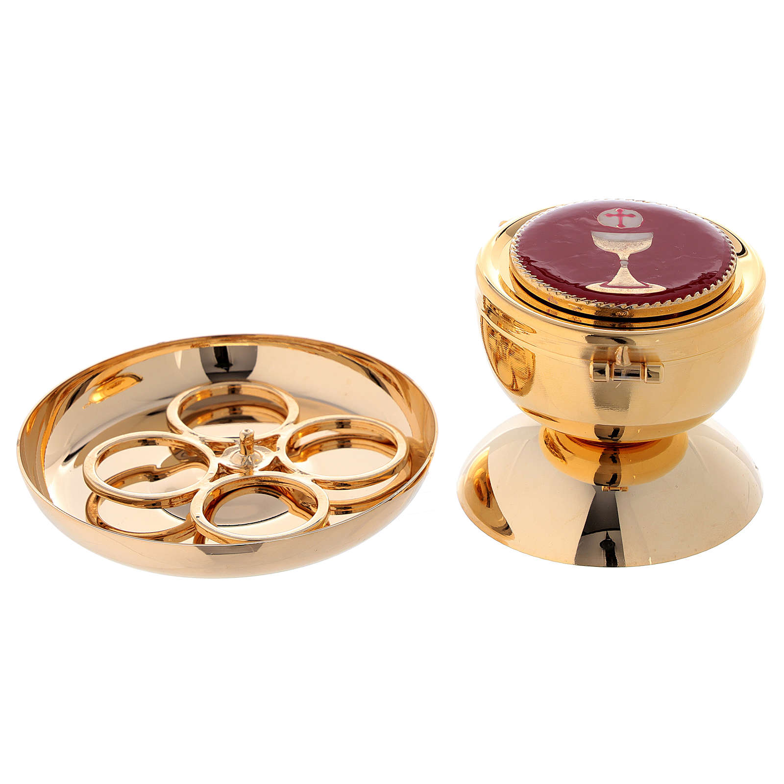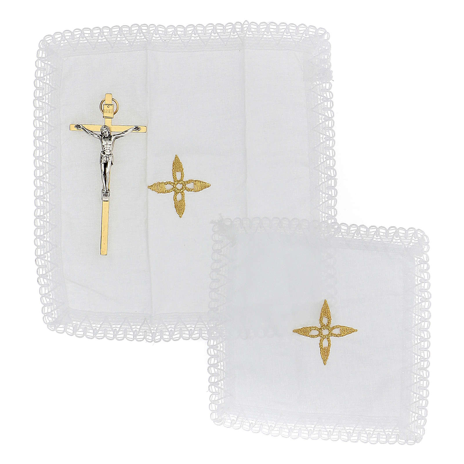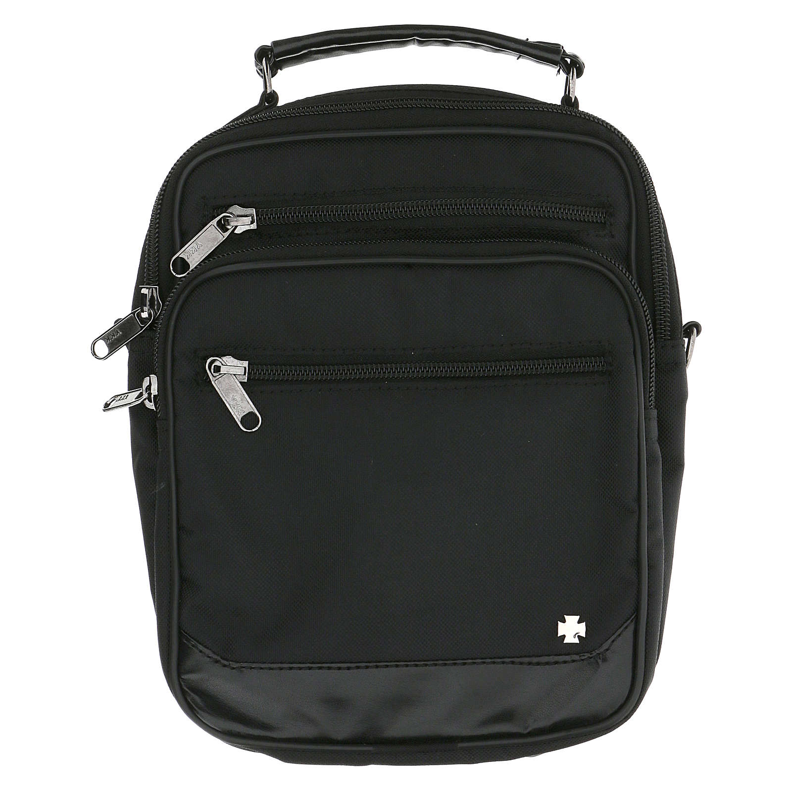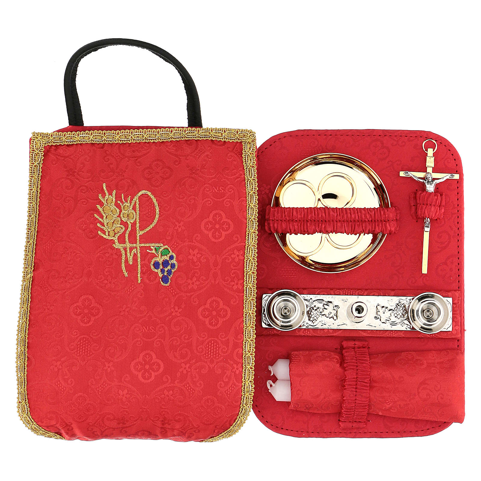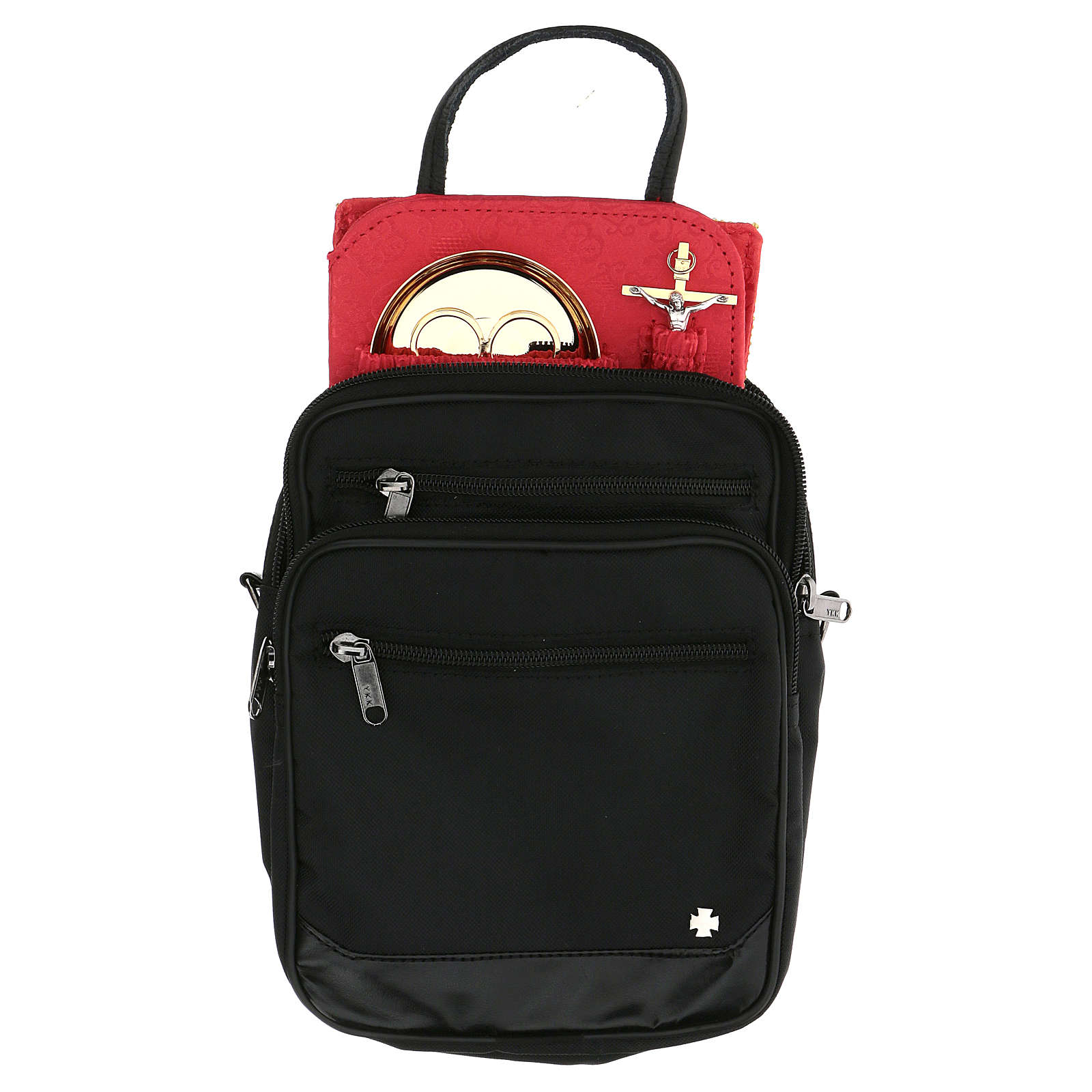 Sacoche tissu technique imperméable set célébrations. Sacoche en bandoulière en tissu imperméable noir avec panneau interne amovible en jacquard rouge contenant un calice en laiton avec dorure 24K avec custode à hosties intégrée, un aspersoir, une patène, un vase pour Huiles Saintes, un autel avec support pour croix et deux bougies, bougies en cire, croix pastorale, deux burettes de 30 ml pour eau et vin, une étole bicolore et un set de linge d'autel avec croix brodée en fil doré.Article réalisé par une importante entreprise spécialisée italienne.