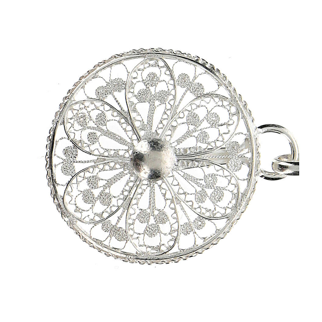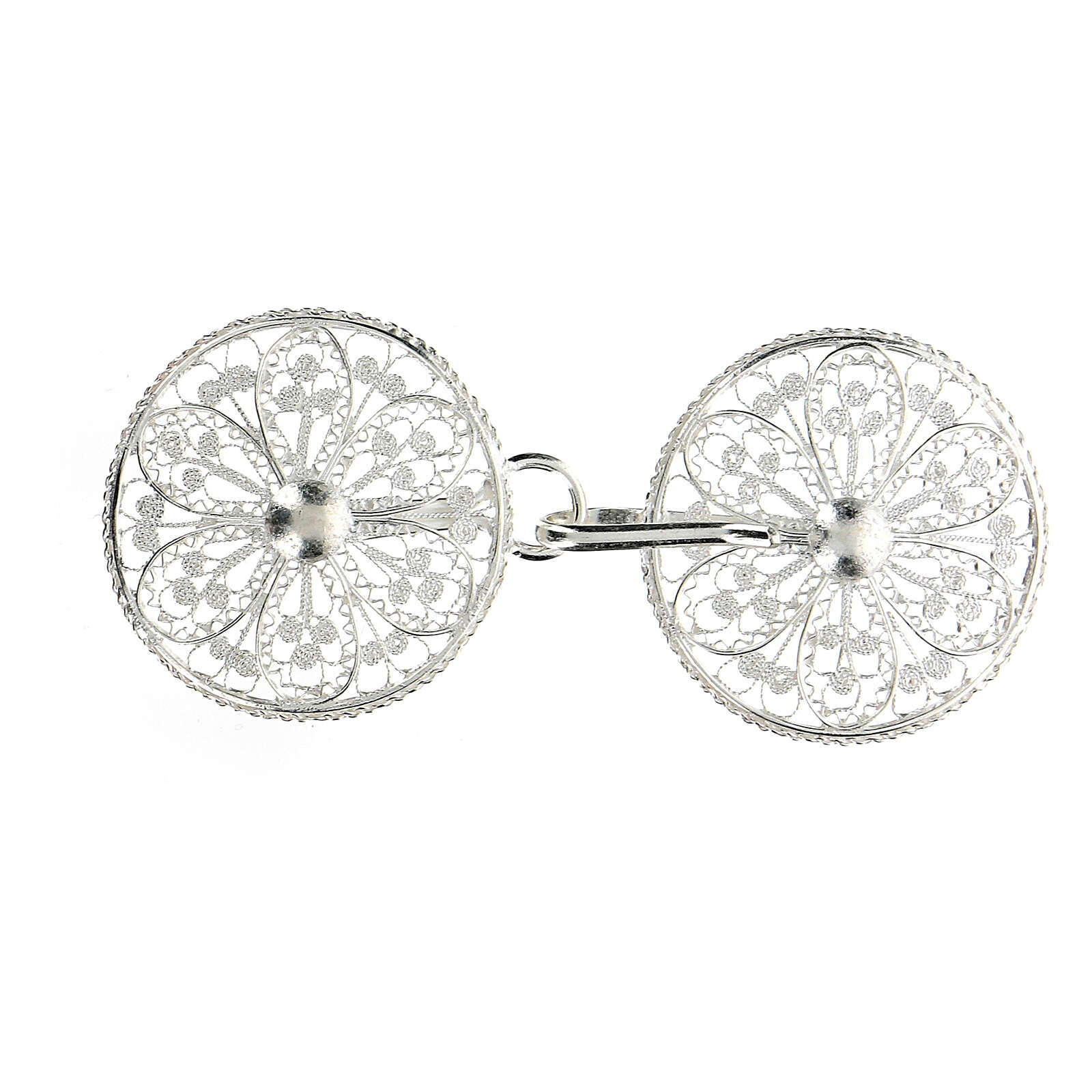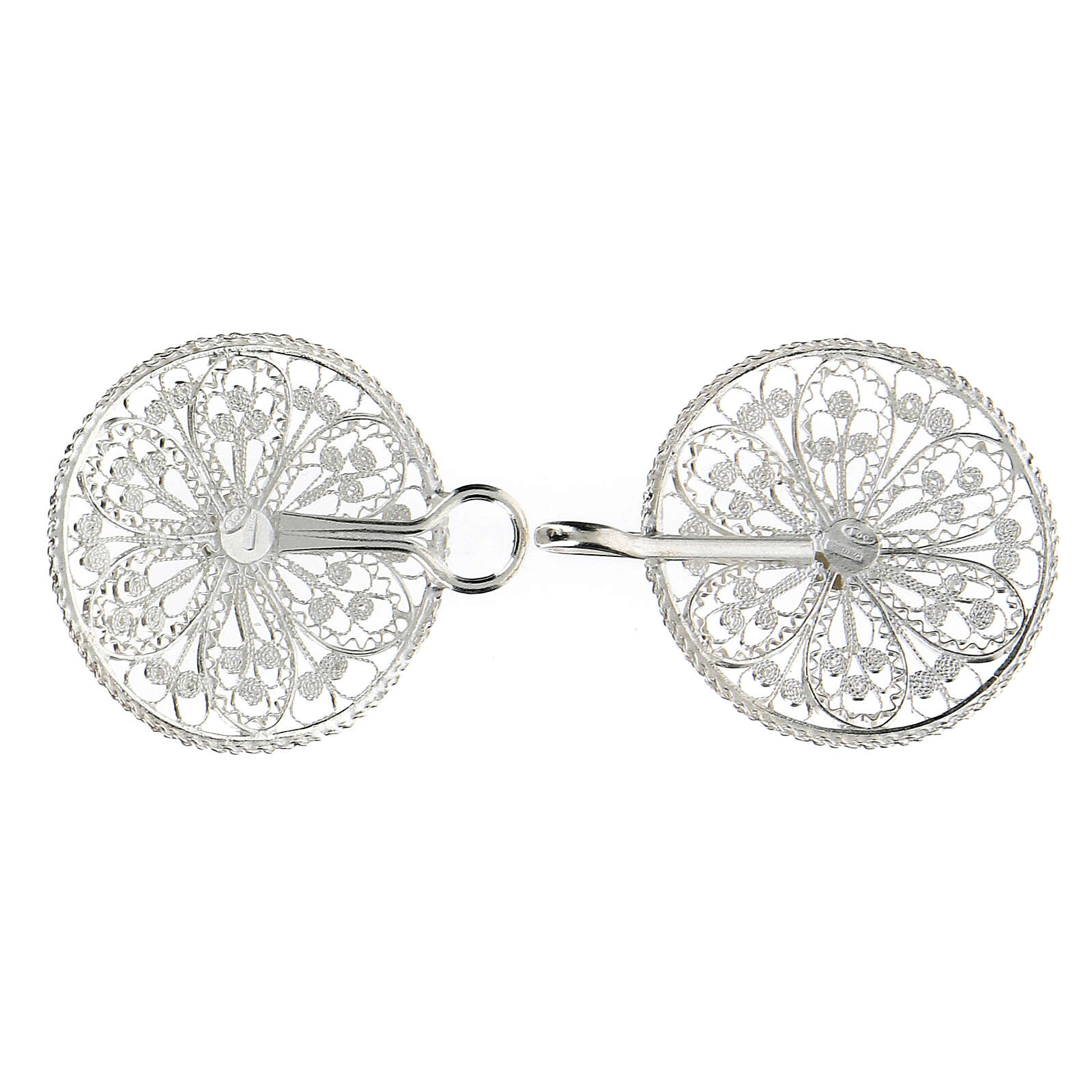 Accroches pour chape avec fleur en argent 800. Élégantes et précieuses attaches pour chape en filigrane d'argent 800, réalisées en Italie par des artisans expérimentés dans le travail de l'argent.Poids : 7 gr.