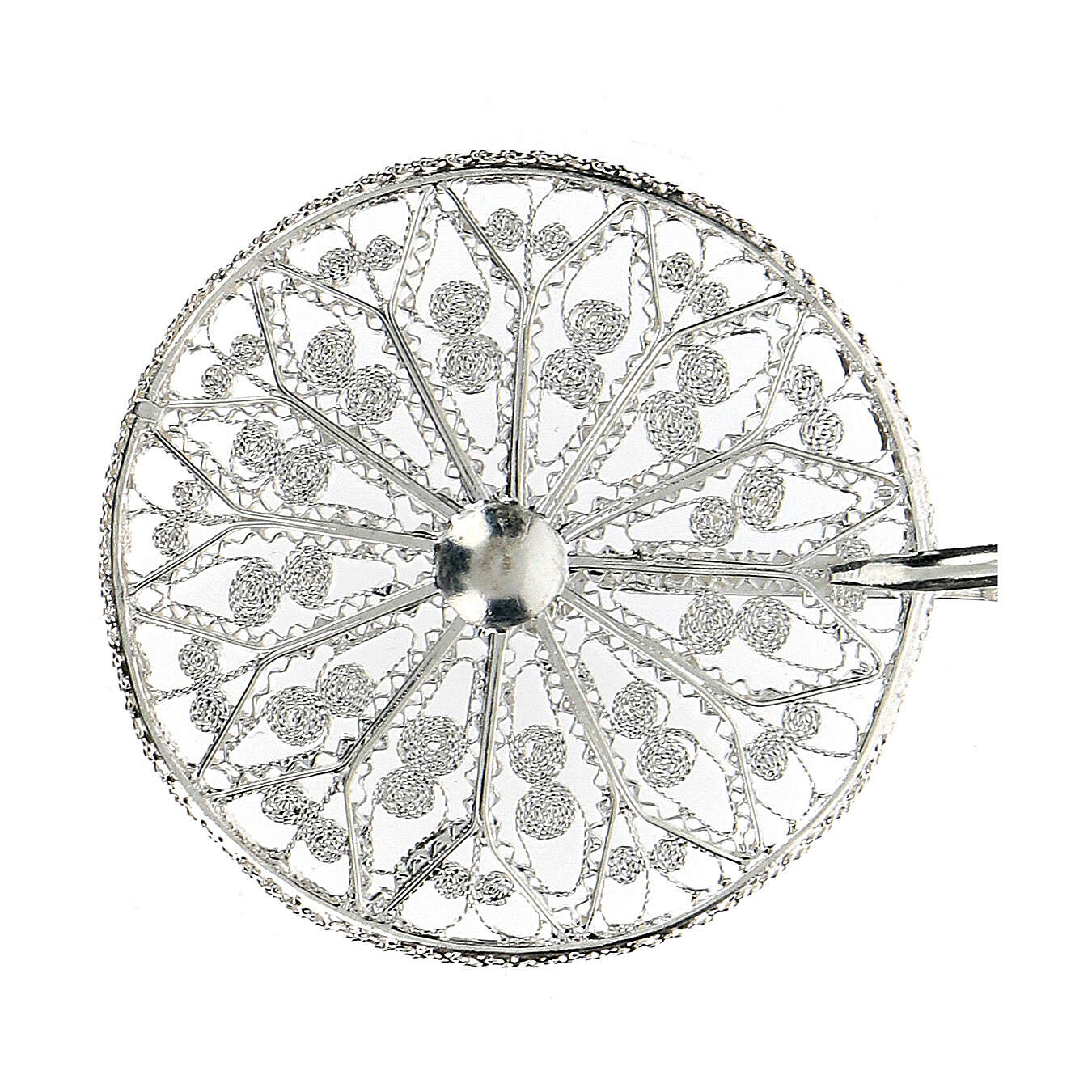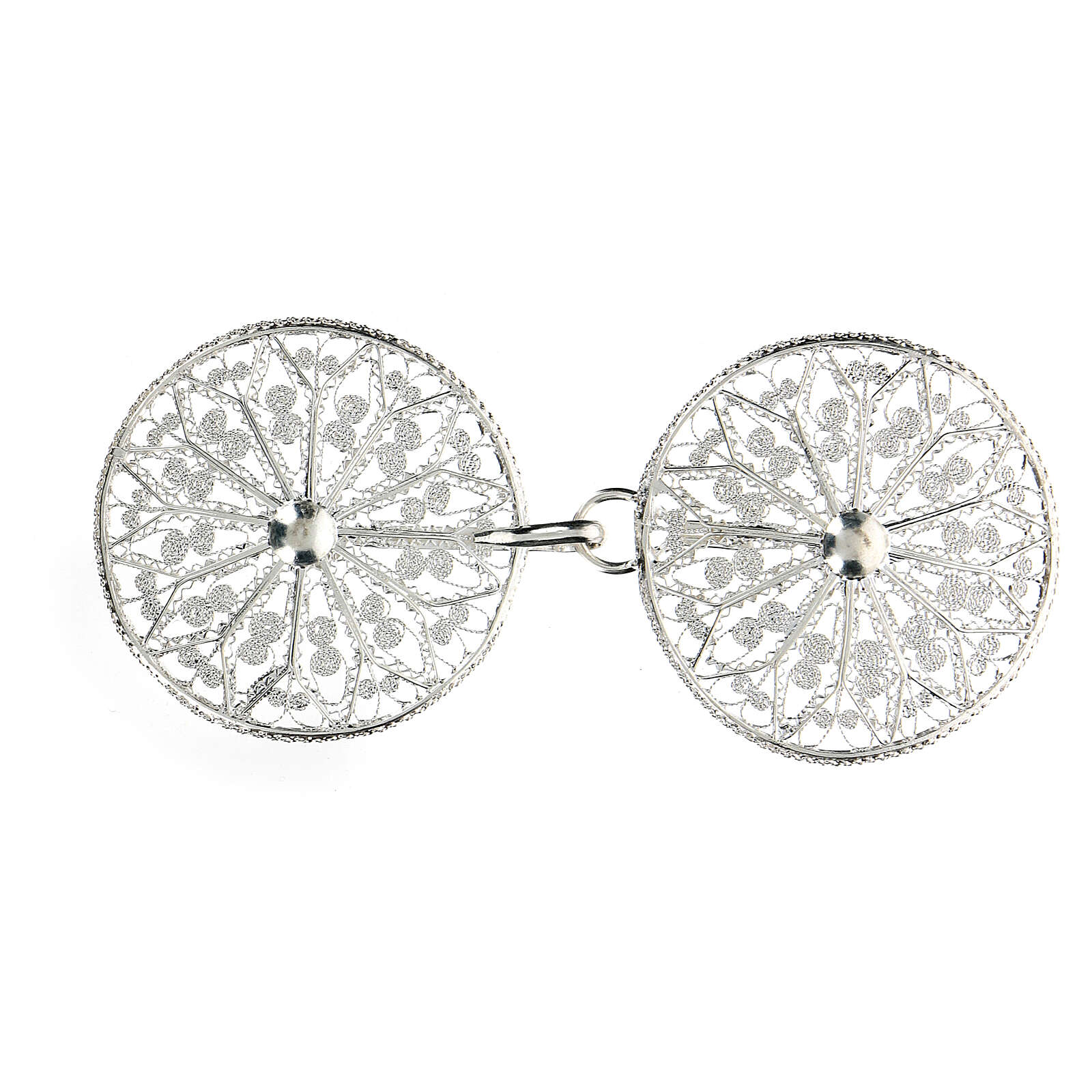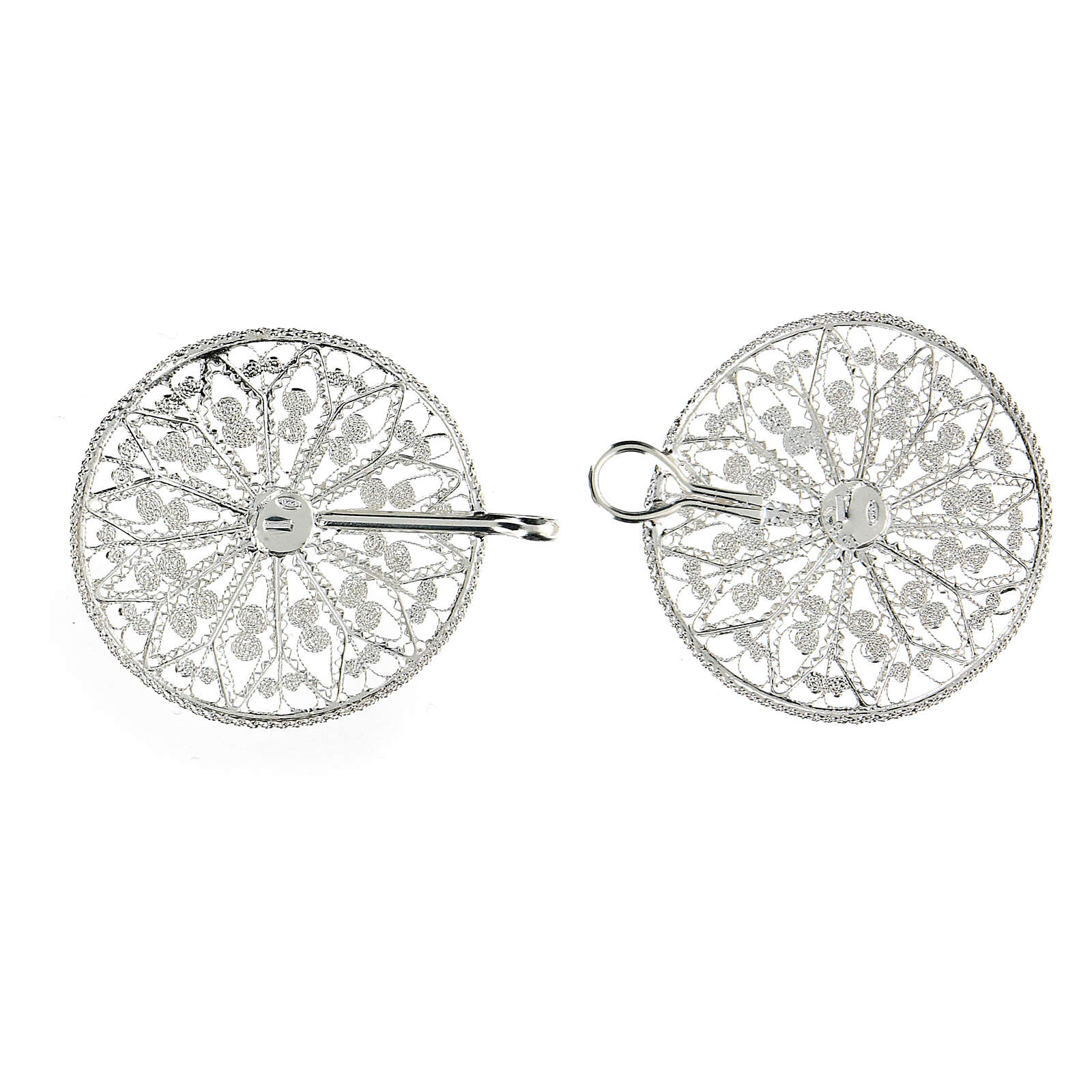 Accroches pour chape filigrane en argent 800 fleur. Élégantes et précieuses attaches pour chape en filigrane d'argent 800, réalisées en Italie par des artisans expérimentés dans le travail
