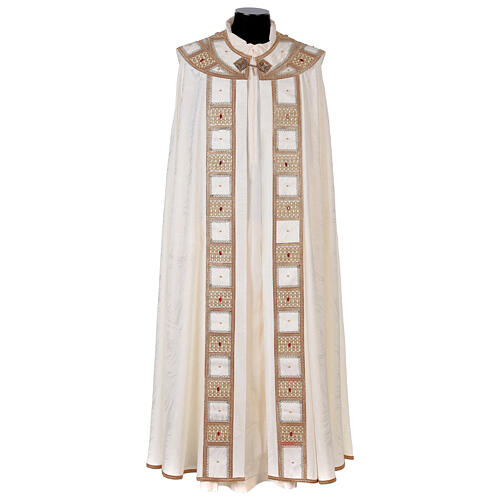 Chape acétate viscose strass passementeries dorées croix. Riche chape en tissu léger d'acétate et lurex avec un délicat effet strié brillant et mat. Le col, fermé par une élégante accroche au dessin complexe, l'avant et l'arrière de la chape sont tous décorés de rubans en fil doré, précieuses passementeries, 40 pierres strass et 50 perles dorées.