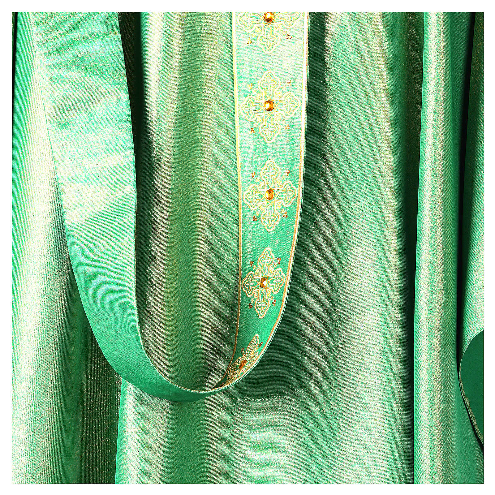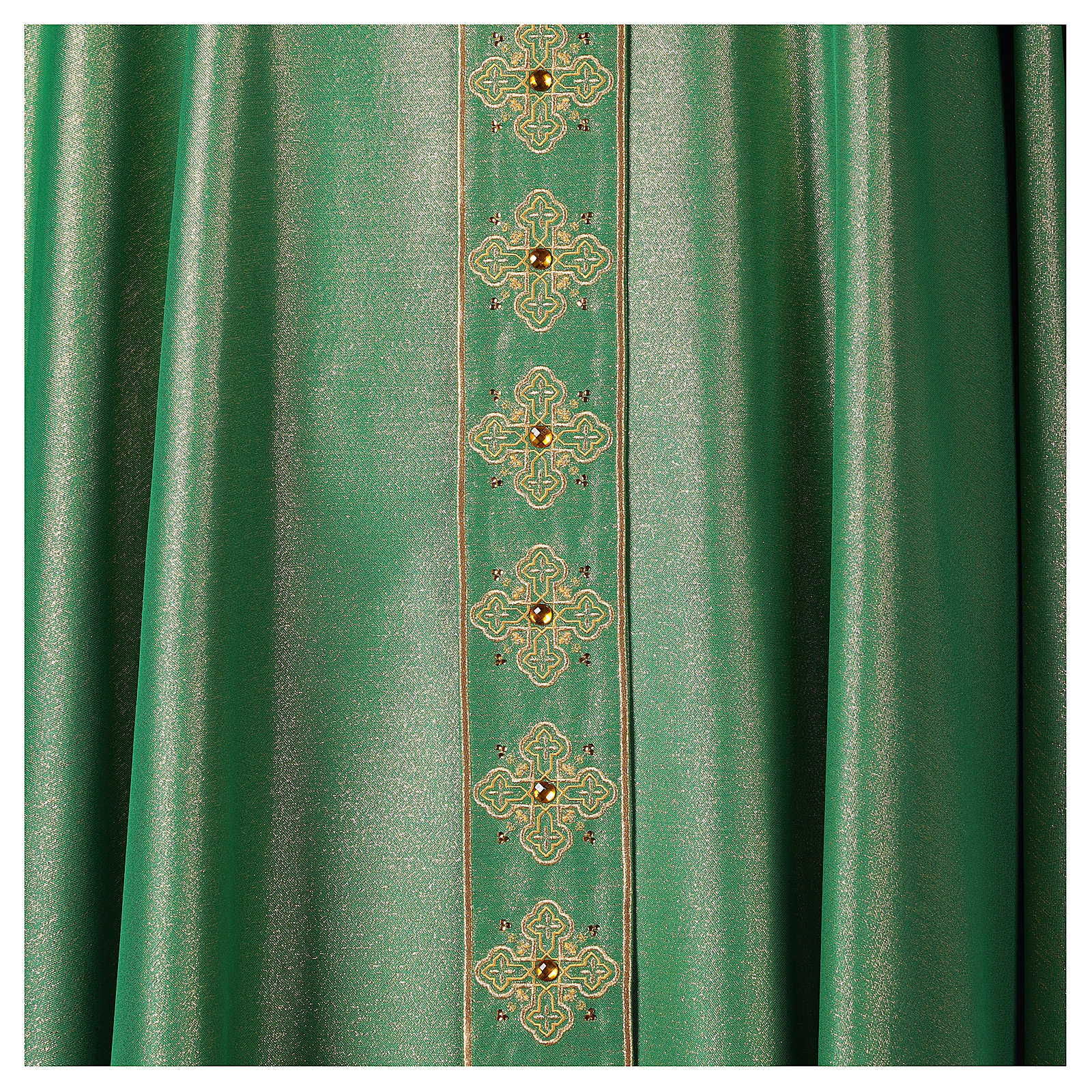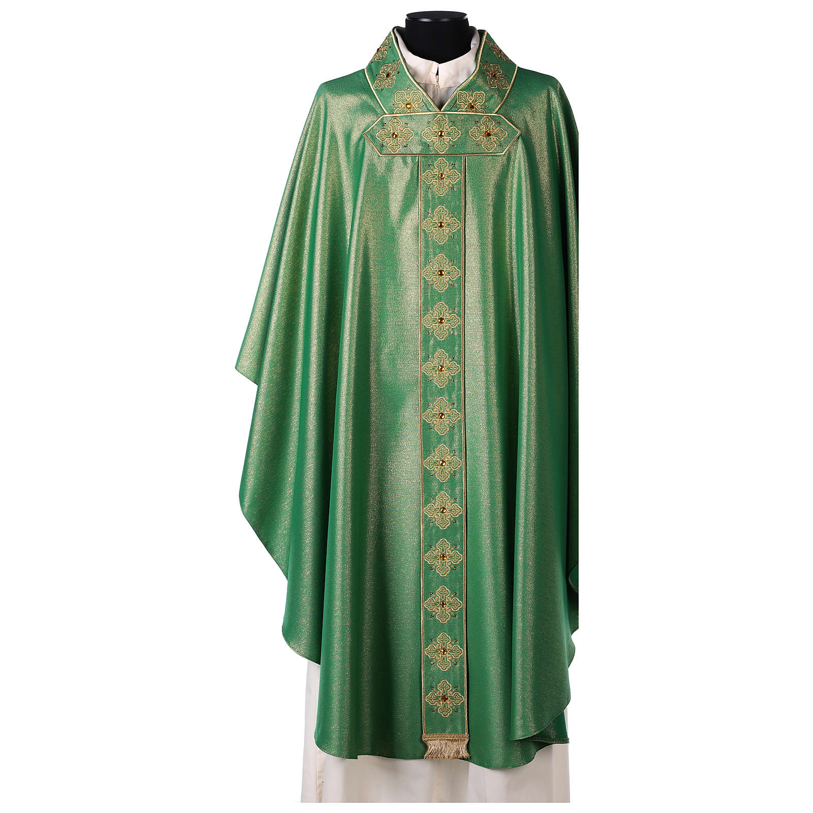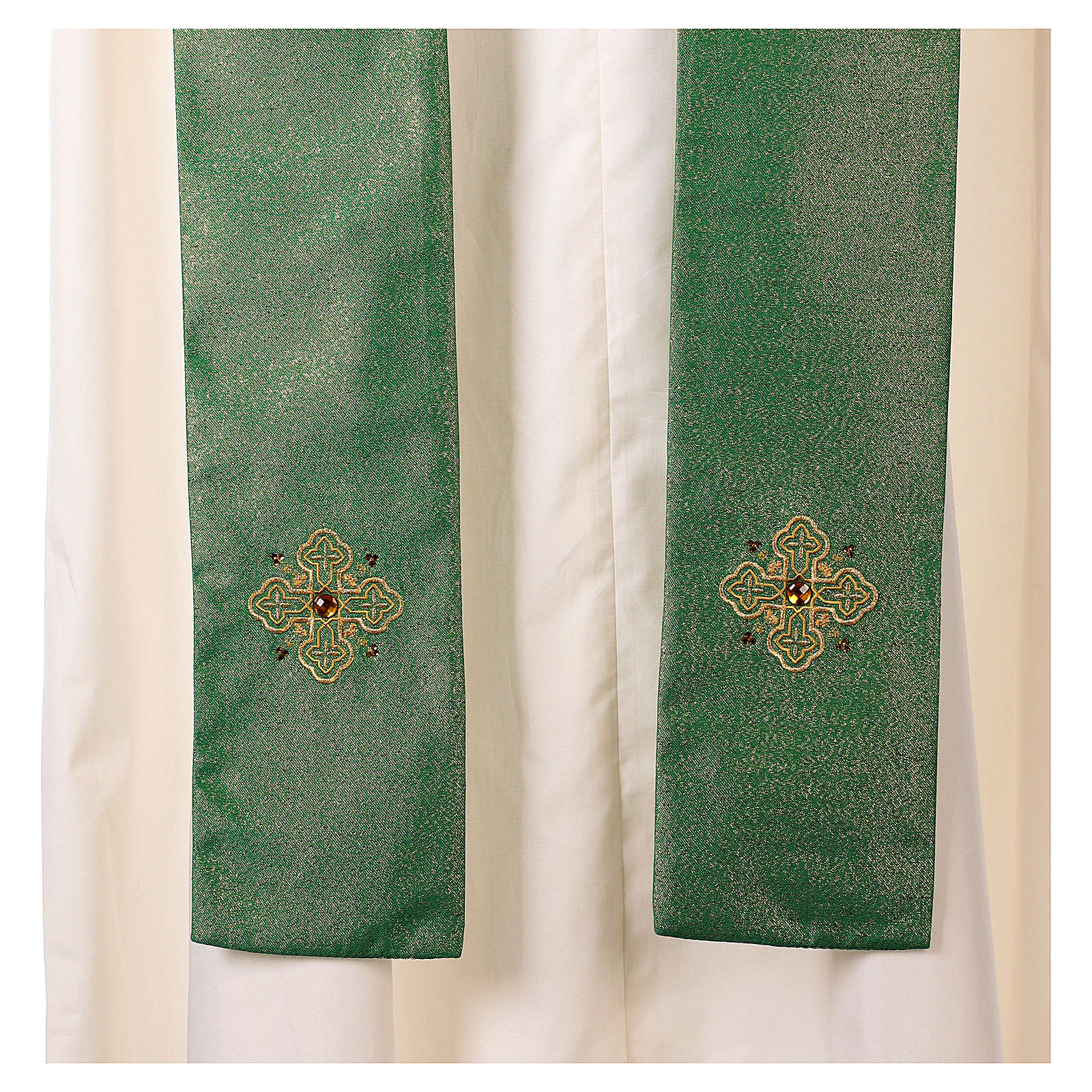 Chasuble croix décorée de pierres 100% polyester. Riche chasuble en polyester tissée avec fils colorés et dorés pour une luminosité exquise. Le col et la bande centrale sont décorés de croix brodées en fil doré et incrustées de pierres lumineuses de deux tailles différentes.Ornement liturgique confectionné dans un atelier de couture polonais, livré avec étole assortie.Disponible dans les 4 couleurs liturgiques.