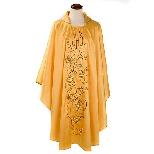 Chasuble dorée en tissu shantung. Chasuble avec broderies sur le devant et le derrière qui reproduisent des rameaux, raisins et épis. Sur le devant l'écriture IHS.