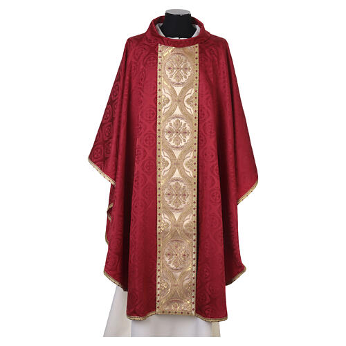 Chasuble en précieux tissu damassé 100% acétate bande centrale brocart. Chasuble en tissu damassé avec bande centrale appliquée en brocart, produite par un atelier artisanal avec plus de 50 ans
