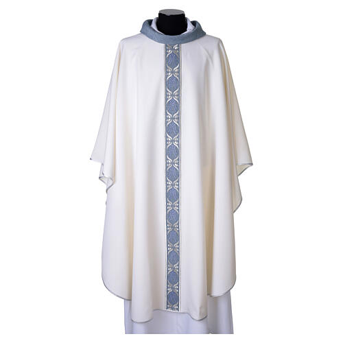 Chasuble de couleur ivoire confectionnée en Italie. Le galon central est enrichi de broderies florales alternant avec un monogramme marial de teinte azur. Le col montant reprend le dessin du galon. Étole assortie incluse, rehaussée de détails argentés.