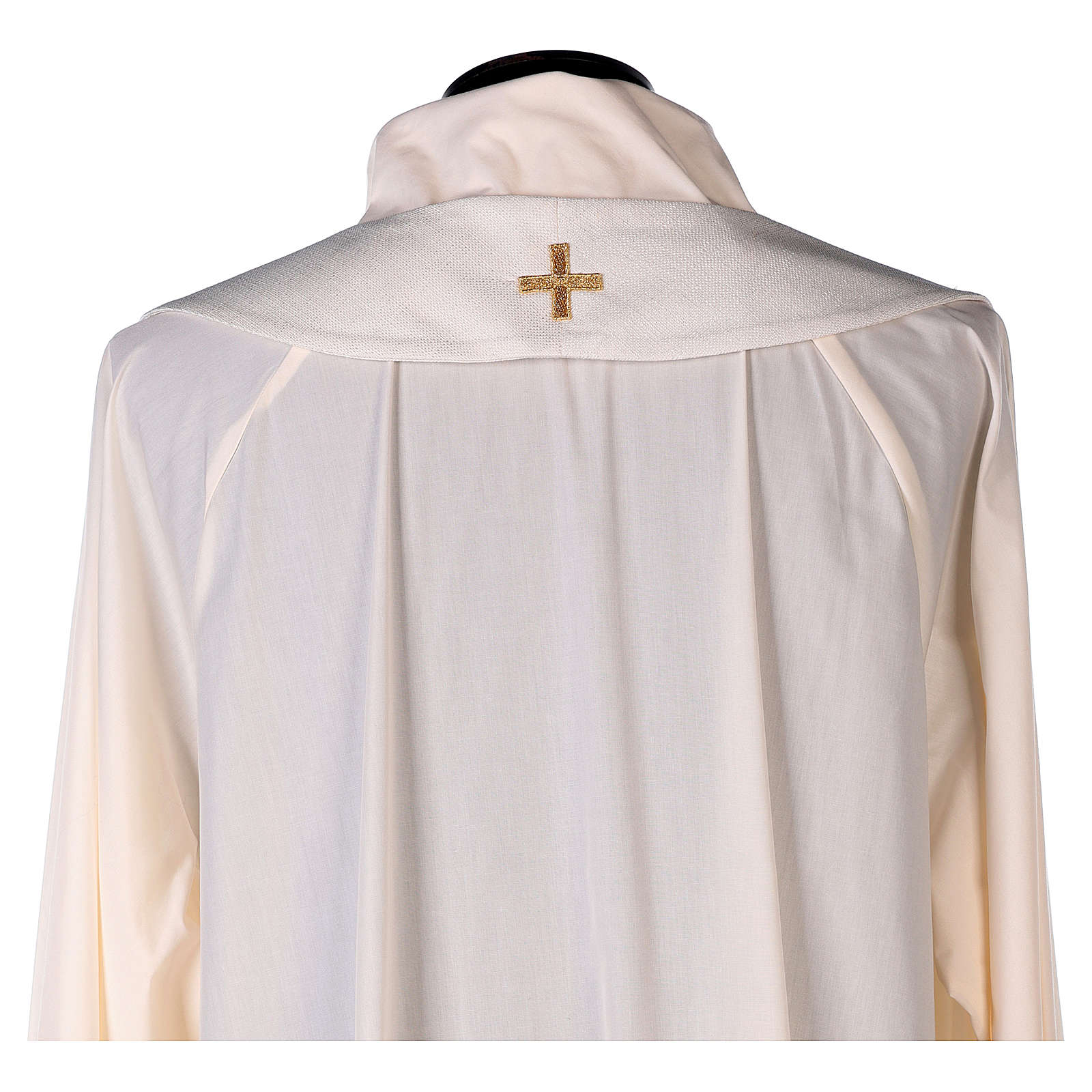 Chasuble mariale ivoire lys dorés monogramme Marie. Chasuble mariale raffinée en tissu couleur ivoire avec bande centrale en velours avec le monogramme marial brodé en deux tonalités d'or et, en-dessous, des lys en fil doré.Ornement liturgique confectionné dans un atelier de couture polonais.