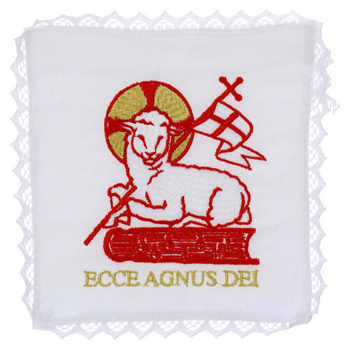 Set complet de linge d'autel en tissu 100% lin avec broderie de l'Agnus Dei. Le set est confectionné en lin pur, matériau adapté au linge d'autel.