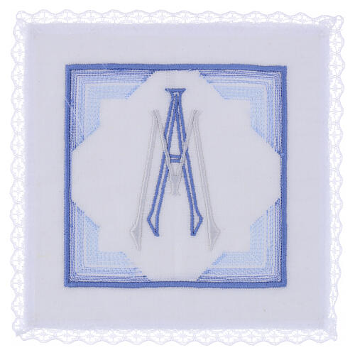 - pale rigide avec broderie de la lettre M et motif marial stylisé en fil bleu azur (17x17 cm)