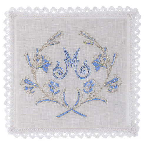 Linge pour autel lin M marial gris bleu clair avec fleurs. Service de linge d'autel en lin décoré d'une broderie qui représente les initiales mariales en gris et bleu clair, entourées de fleurs bleu clair.