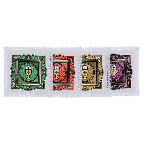 Palle pour couvrir le calice fabriquée en Italie par un atelier spécialisé, disponible dans les quatre couleurs liturgiques traditionnelles. Sur le devant, une impression haute définition représente un calice surmonté d'une hostie, insérée dans un élégant entrelacement de cercles et de carrés contenant des motifs géométriques décoratifs, symboles d'harmonie et de sacré.