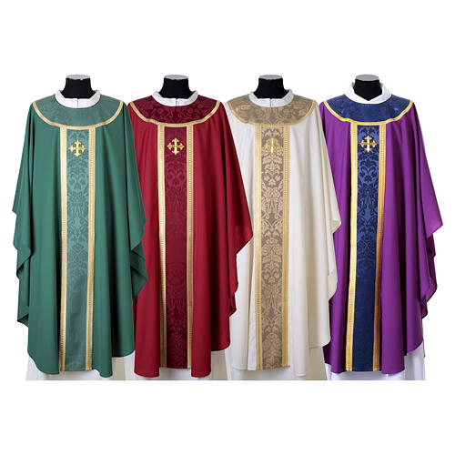 Accompagnée d'une étole, cette chasuble présente des décorations autour du col en damas avec galon doré et croix brodée.