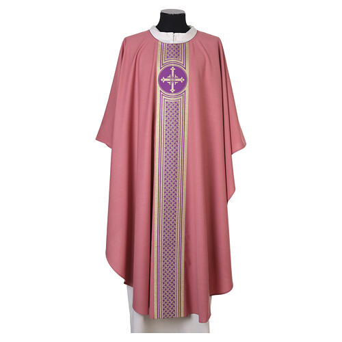 De couleur rose, cette veste liturgique est caractérisée par une sobre décoration dorée avec une croix au niveau du galon.
