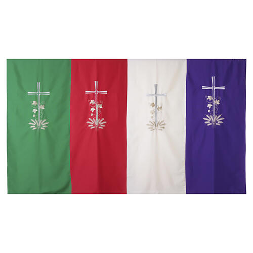 Conçu pour accompagner l'année liturgique, ce voile est disponible en quatre couleurs liturgiques fondamentales (ivoire, rouge, vert, violet), le motif restant identique pour toutes les variantes.