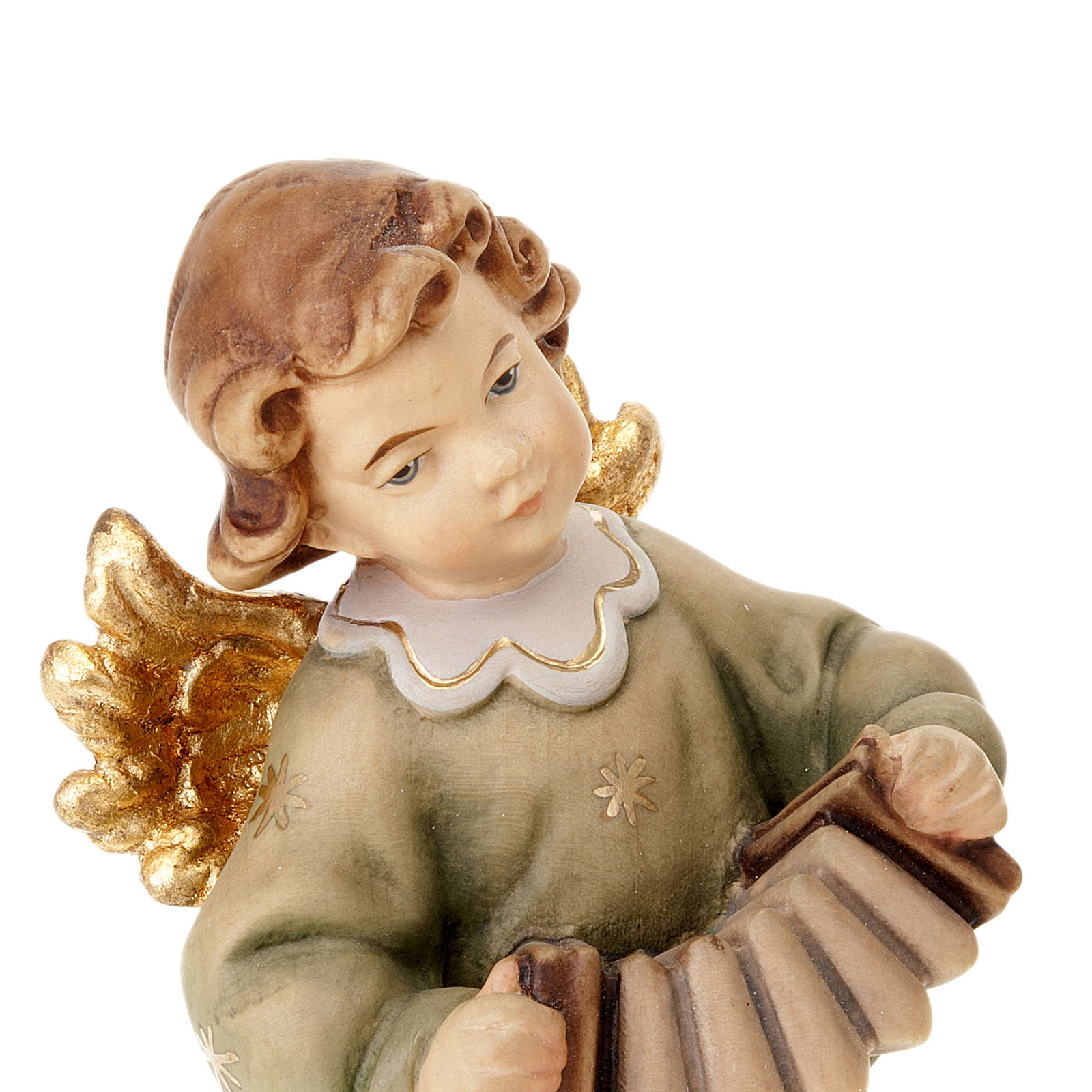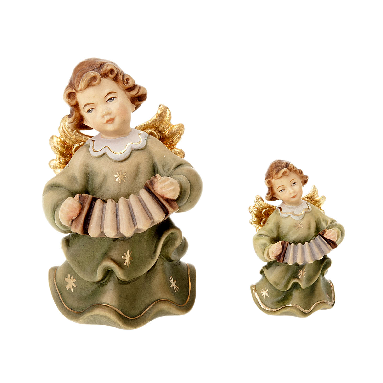 Ange avec accordéon. Statue peinte à la main idéale à accrocher, en bois d'érable, réalisée par les artisans de la Valgardena. Un papier parchemin aux pieds de l'ange permet d'écrire un mot. Disponible en: 8 cm et 14 cm. Choisissez la mesure que vous souhaitez