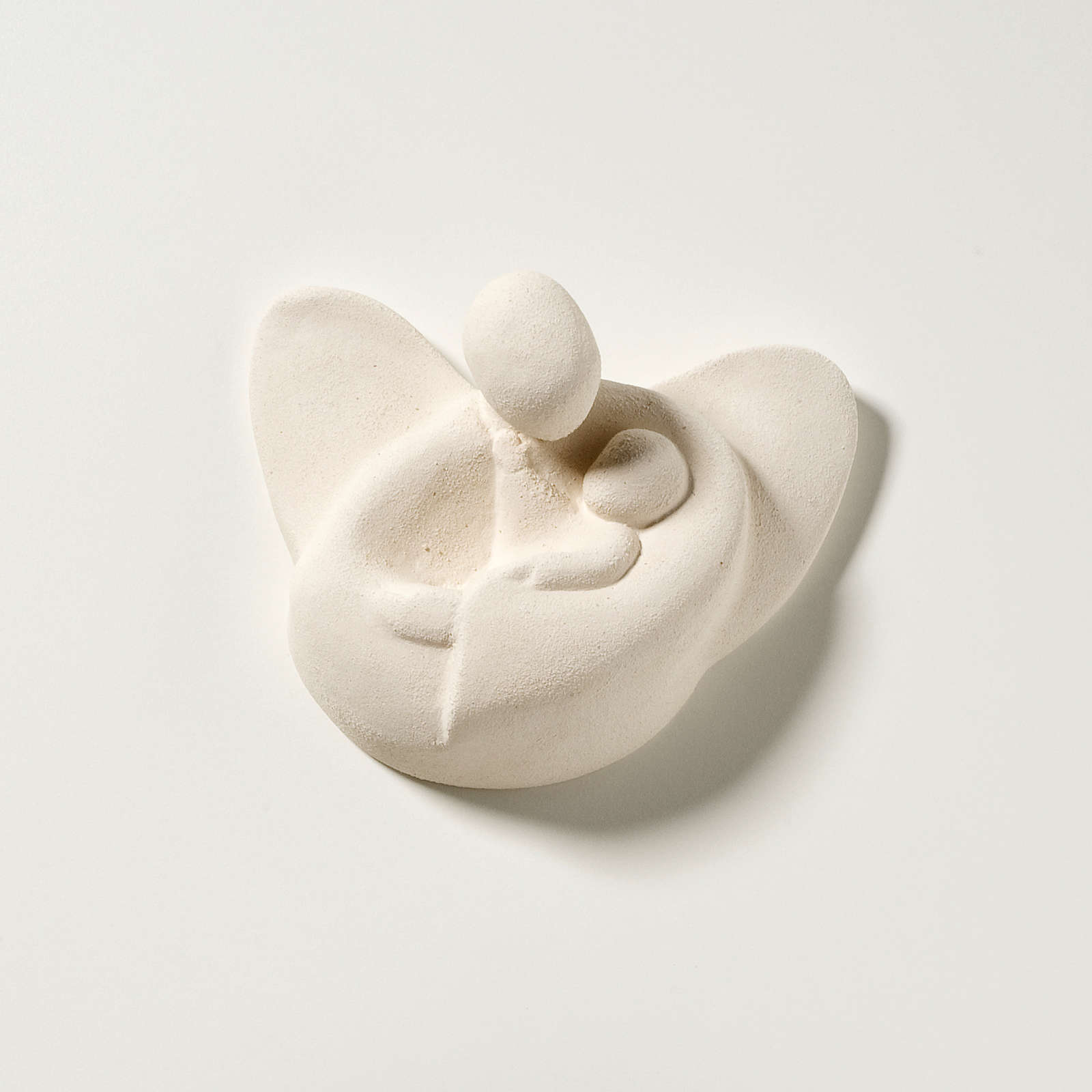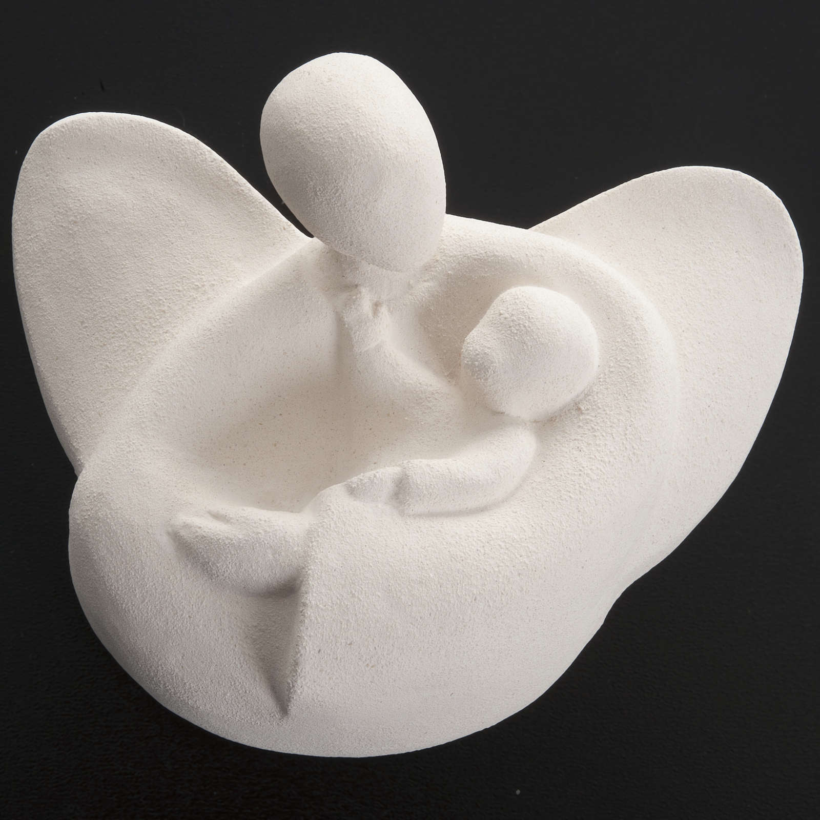 Ange avec enfant en argile réfractaire. Statue stylisée réalisée à la main, en Italie, en argile réfractaire blanche. L'argile est travaillée et moulé à la main et après cuite à plus de 1000°C. Produit d'haute qualité complètement réalisé en Italie dans le Centre Ave de Loppiano (Florence).