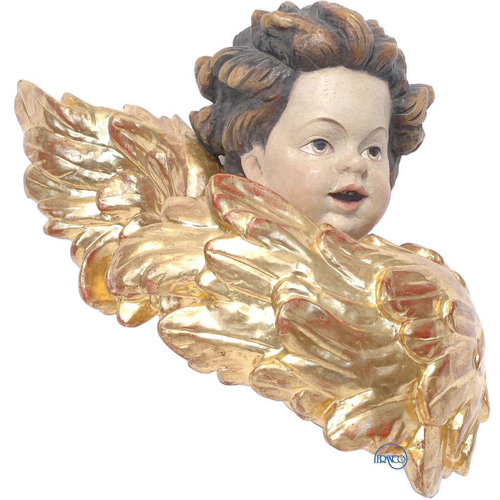 Tête de chérubin 30 cm bois peint Valgardena fin. vieillie. Ange en bois d'érable peint, réalisé à la main par les artisans de la Valgardena selon les traditions locales.