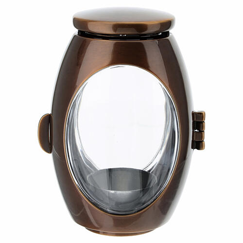 Lampe funéraire pour veilleuses votives en finition bronze bruni, avec une patine claire résistante aux agents atmosphériques. Protégée des intempéries, cette lampe peut accueillir des bougies d'un diamètre maximal de 6 cm et d'une hauteur maximale de 14 cm.