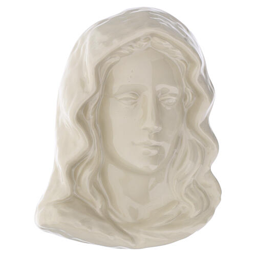 Plaque murale en haut-relief représentant le visage de Marie, encadré d'un voile ondoyant. Cette plaque, sobre et élégante, est idéale pour la décoration de monuments, pierres tombales et niches, et convient pour une installation en extérieur. La porcelaine présente une patine brillante.