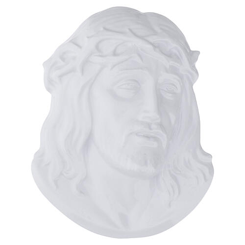 Plaque en bas-relief murale représentant le visage de Jésus-Christ ceint de la couronne d'épines, souffrant durant la Passion. Le décor, émaillé en blanc, est adapté à une utilisation extérieure et constitue un ornement idéal pour plaques, monuments et pierres tombales.