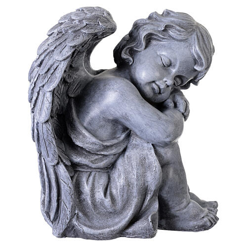 Chérubin recueilli statue d'extérieur 35 cm en résine effet pierre grise finition antique.