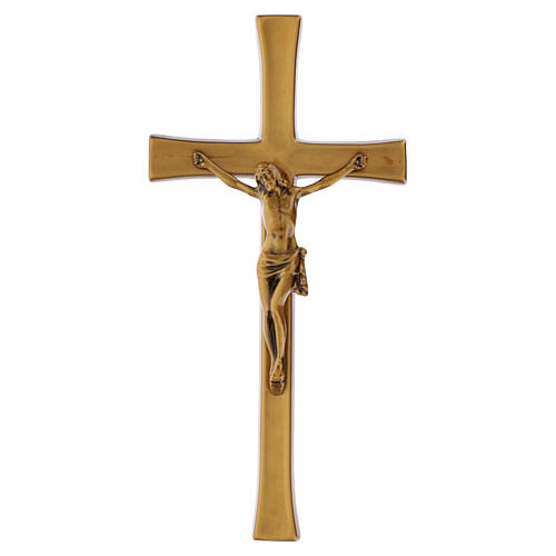 Élément funéraire représentant la croix avec le corps du Christ intégré, conçu pour fixation murale et réalisé en métal avec une finition bronze.