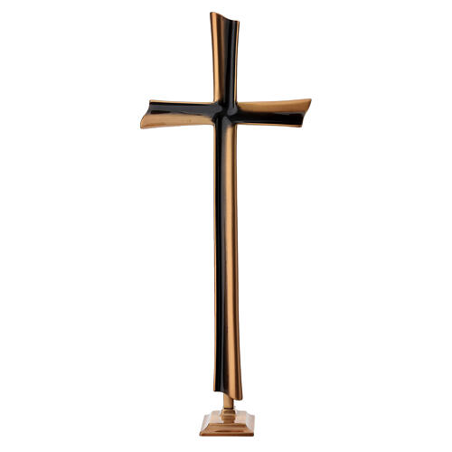 Croix latine biface au design ondulé moderne, posée sur un socle à fixer au sol. Élégante, adaptée à un usage intérieur comme extérieur, cette croix est protégée par une patine spéciale contre les intempéries.