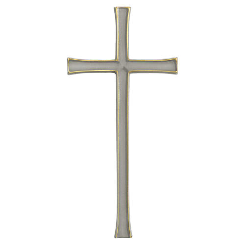 Croix murale, à suspendre avec des broches spéciales incluses, en laiton bronze émaillé gris. Parfait accessoire pour les tombes, adapté à une utilisation en extérieur.