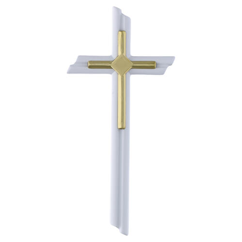 Croix funéraire caractérisée par fixation murale prévue pour usage extérieur, développement vertical régulier et surface continue en finition blanche uniforme, agrémentée de détails dorés appliqués au centre.