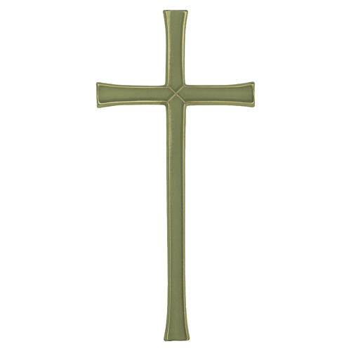 Croix latine avec légère rainure centrale, finition bronze et décorée avec de l'émail vert sauge. Fixations incluses pour montage sur murs et tombes.