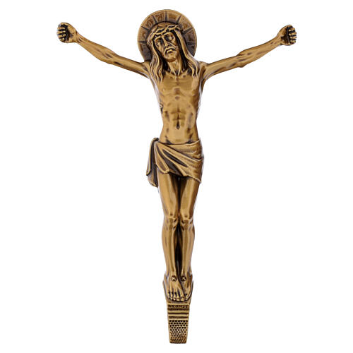 Destiné à une fixation murale, ce corps de Christ présente une silhouette en finition bronze sur une structure figurative autonome aux bras ouverts.