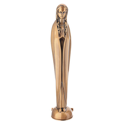 La figure de la Sainte Vierge présente une composition frontale aux lignes élancées et continues, avec un manteau enveloppant et un rendu stylisé des volumes. La statue est complétée par une console de support assurant un positionnement correct sur la paroi.
