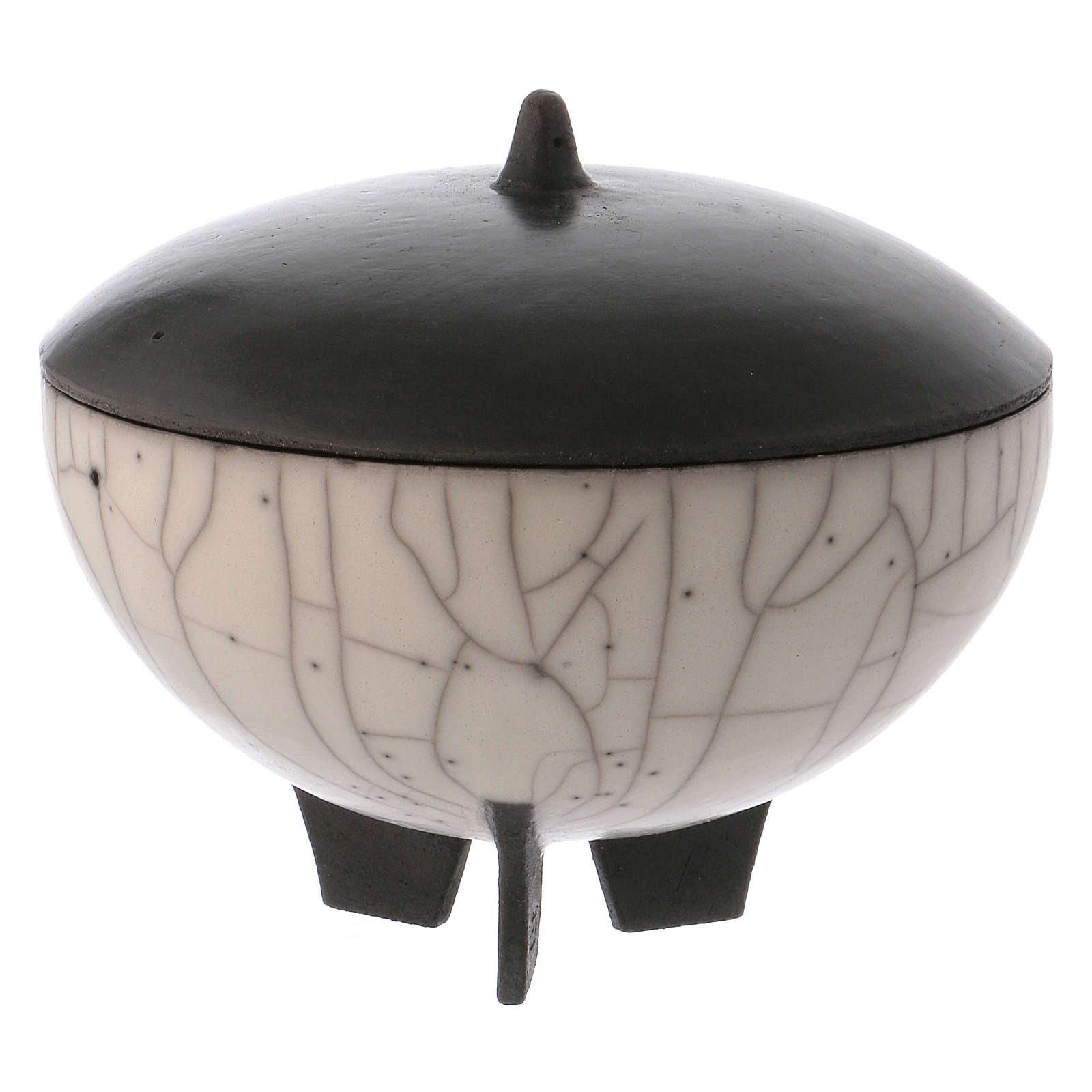 Urne funéraire en céramique Raku série Circle. Urne funéraire entièrement réalisée à la main et cuite selon l'ancienne technique Japonaise du Raku et enrichie de la méthode Kintsugi avec des raisins à deux composants.