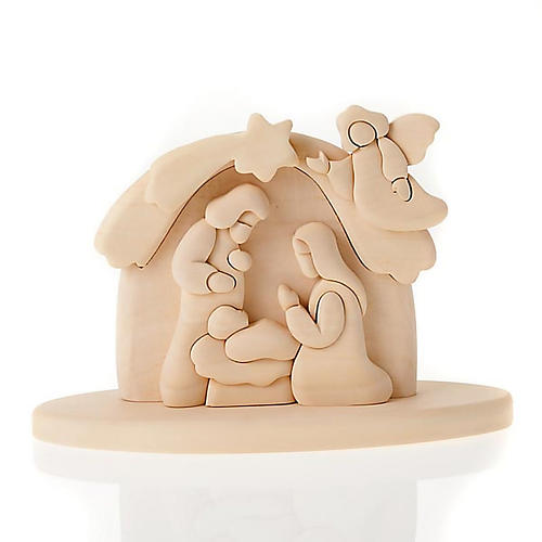 Bas relief en bois, sainte famille. Bas relief en bois clair avec support.Image en relief de la sainte famille avec ange en vol. Le bas relief est réalisé à la main par les artisans jeune de Loppiano. Idéal comme idée cadeau.