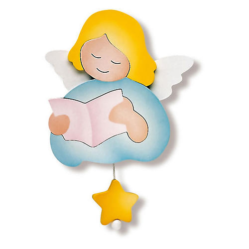 Petit ange en lecture; en tirant la petite corde avec l'étoile le carillon chante une comptine. Il s'agit d'un article réalisé à la main avec la technique de l'aérographe à Loppiano (Florence) par les "Focolarini"