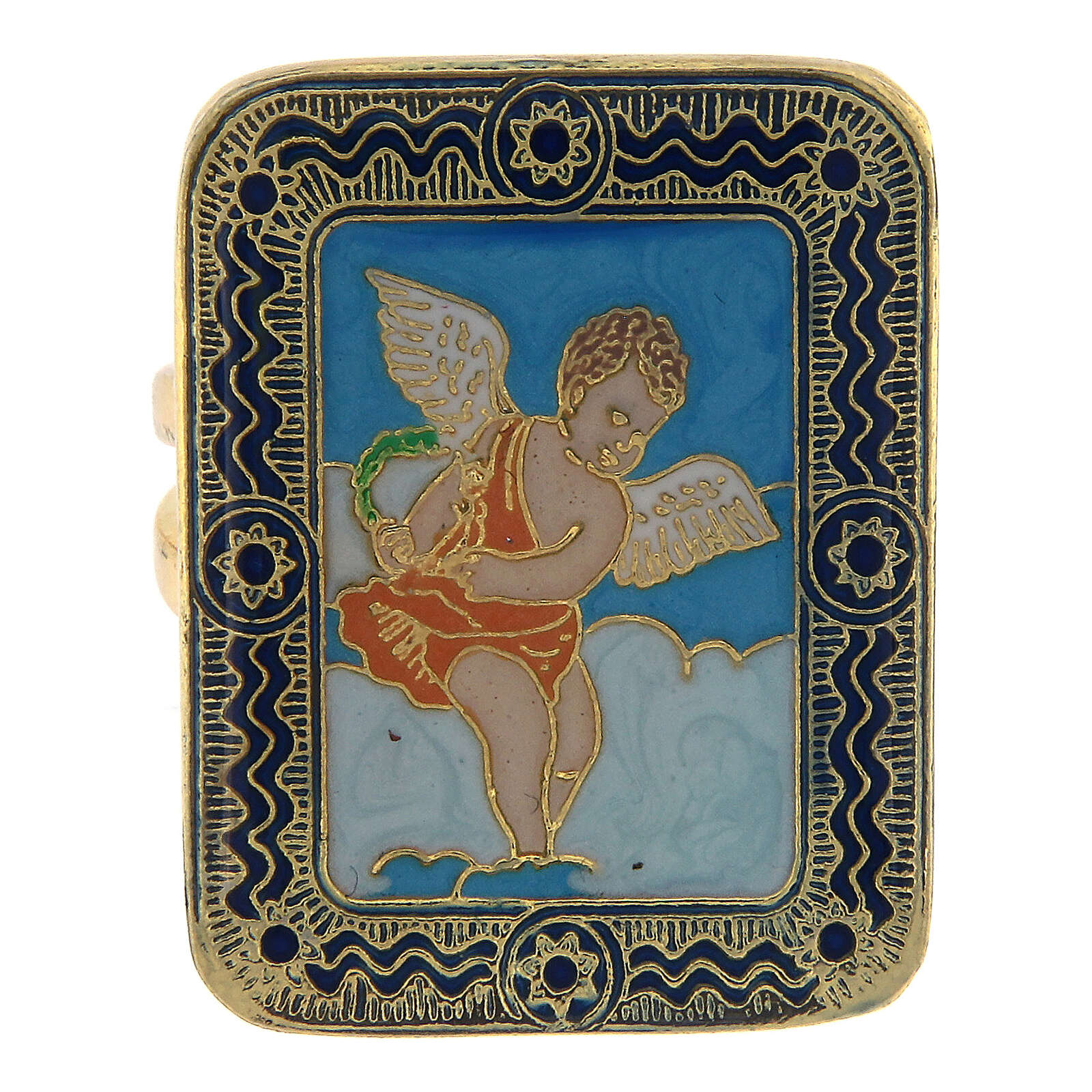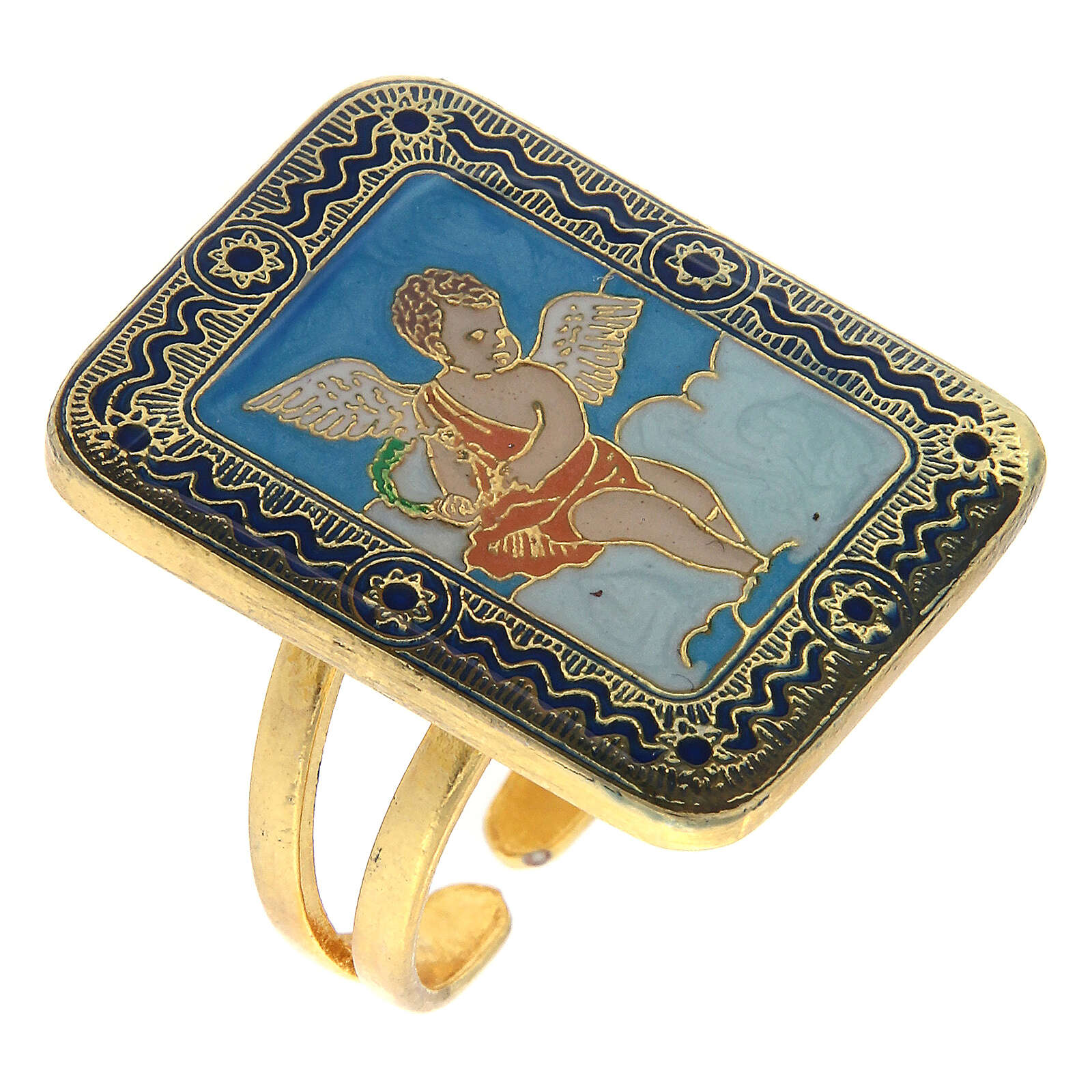 Bague Ange fond turquoise taille réglable. Bague réglable de 15 à 18 mm (diamètre interne de départ : 17 mm) en métal avec finition galvanique doré sans nickel complété par une médaille en zamak de 2,5x1,9 cm. Cette dernière représente un ange au milieu des nuages émaillé à la main sur un fond turquoise.