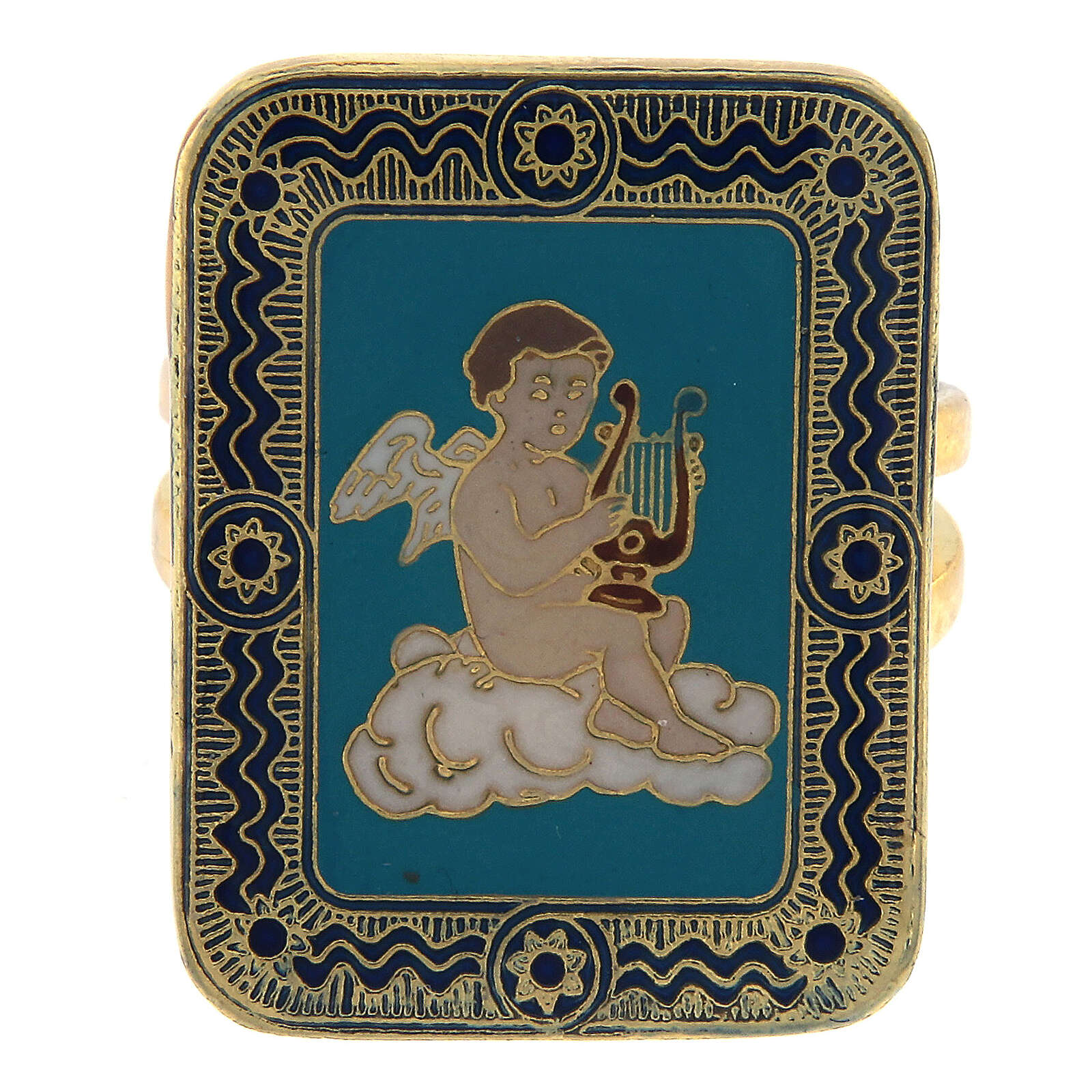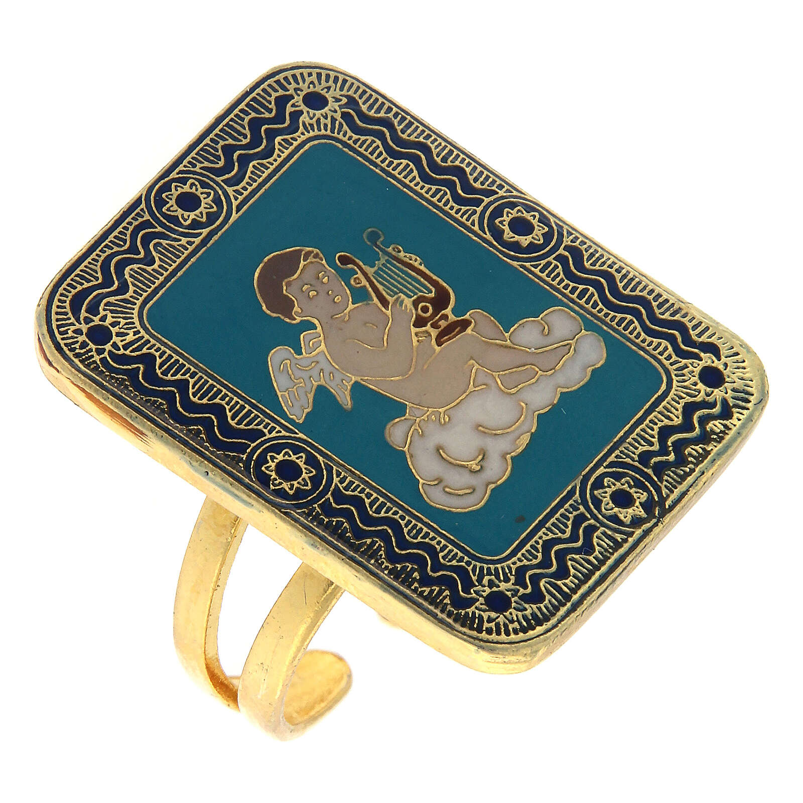Bague Ange musicien taille réglable émail turquoise. Bague réglable de 15 à 18 mm (diamètre interne de départ : 17 mm) en métal avec finition galvanique doré sans nickel complété par une médaille en zamak de 2,5x1,9 cm. Cette dernière représente un ange musicien avec sa lyre émaillé à la main sur un fond turquoise.