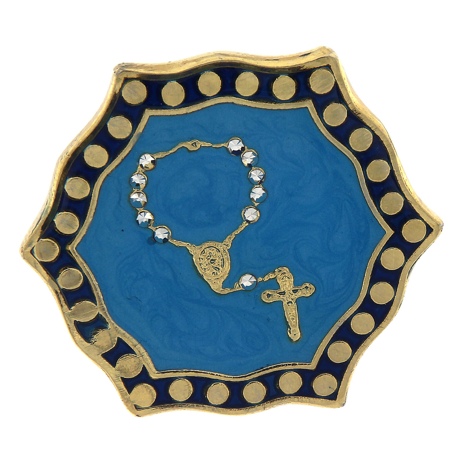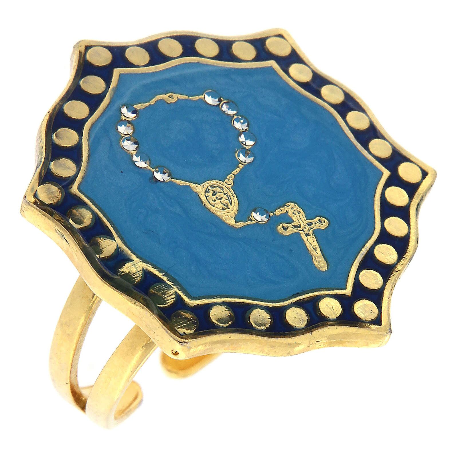 Bague Chapelet dizainier en strass fond turquoise taille réglable. Bague en métal avec finition galvanique dorée sans nickel et image de chapelet dizainier sur médaille en zamak émaillé couleur turquoise décoré de strass Swarovski.