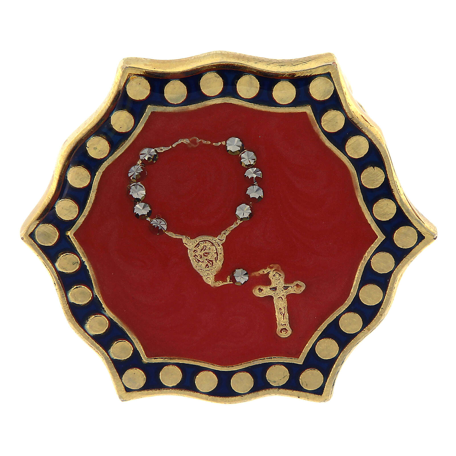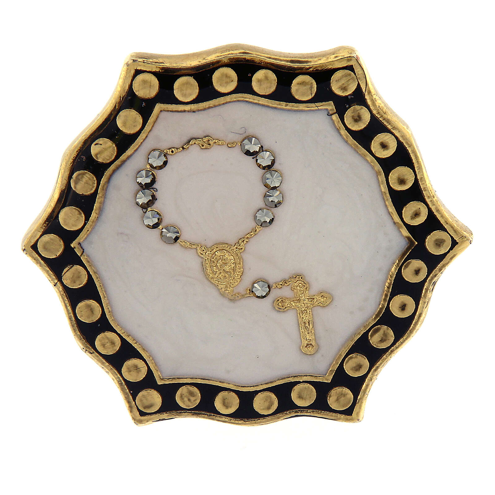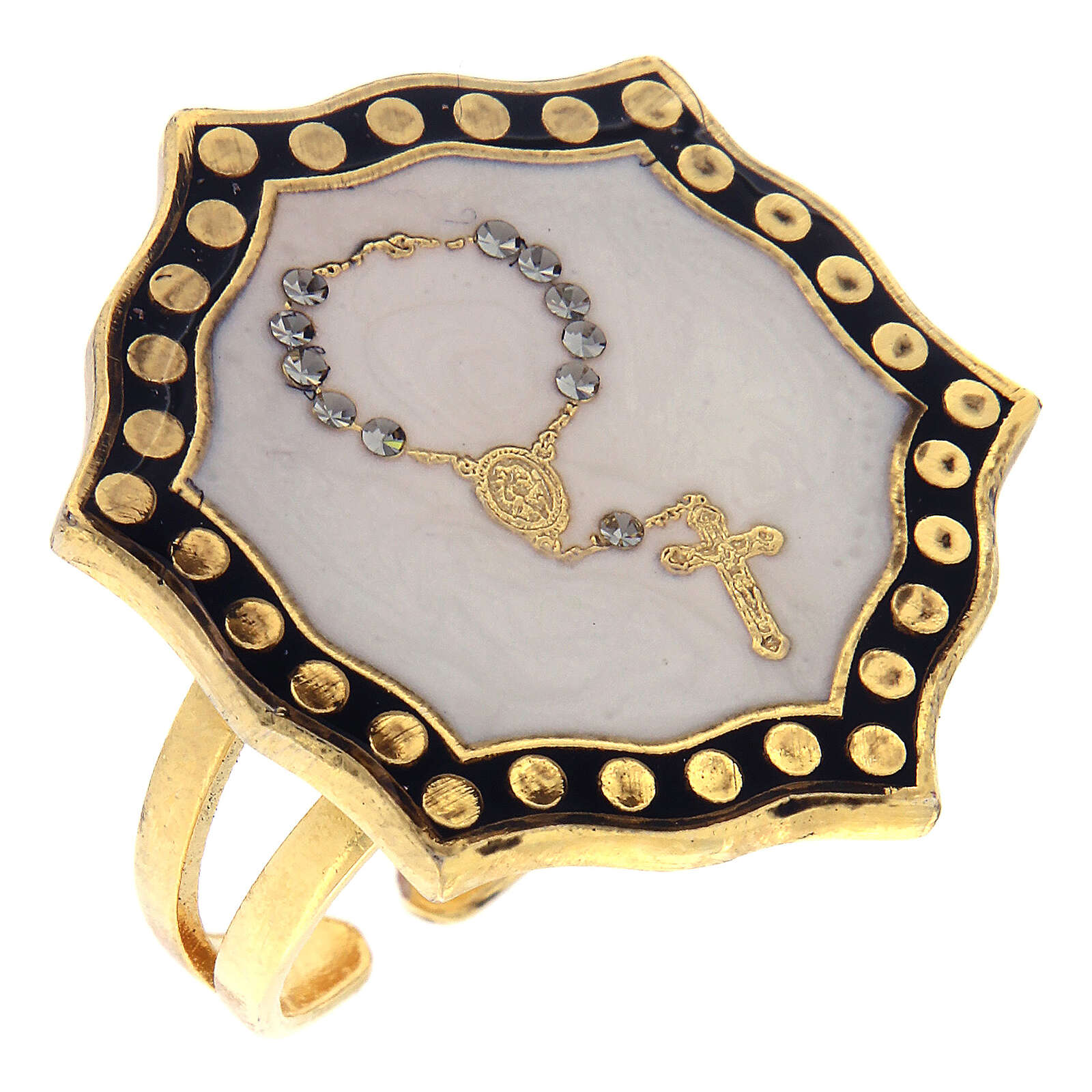 Bague Chapelet dizainier fond nacré taille réglable. Bague en métal avec finition galvanique dorée sans nickel et image de chapelet dizainier sur médaille en zamak émaillé couleur nacre décoré de strass Swarovski.