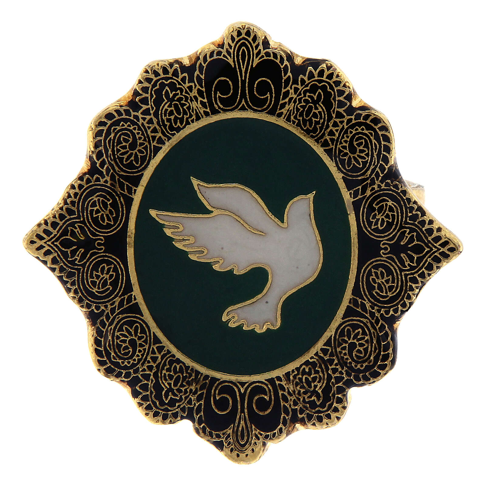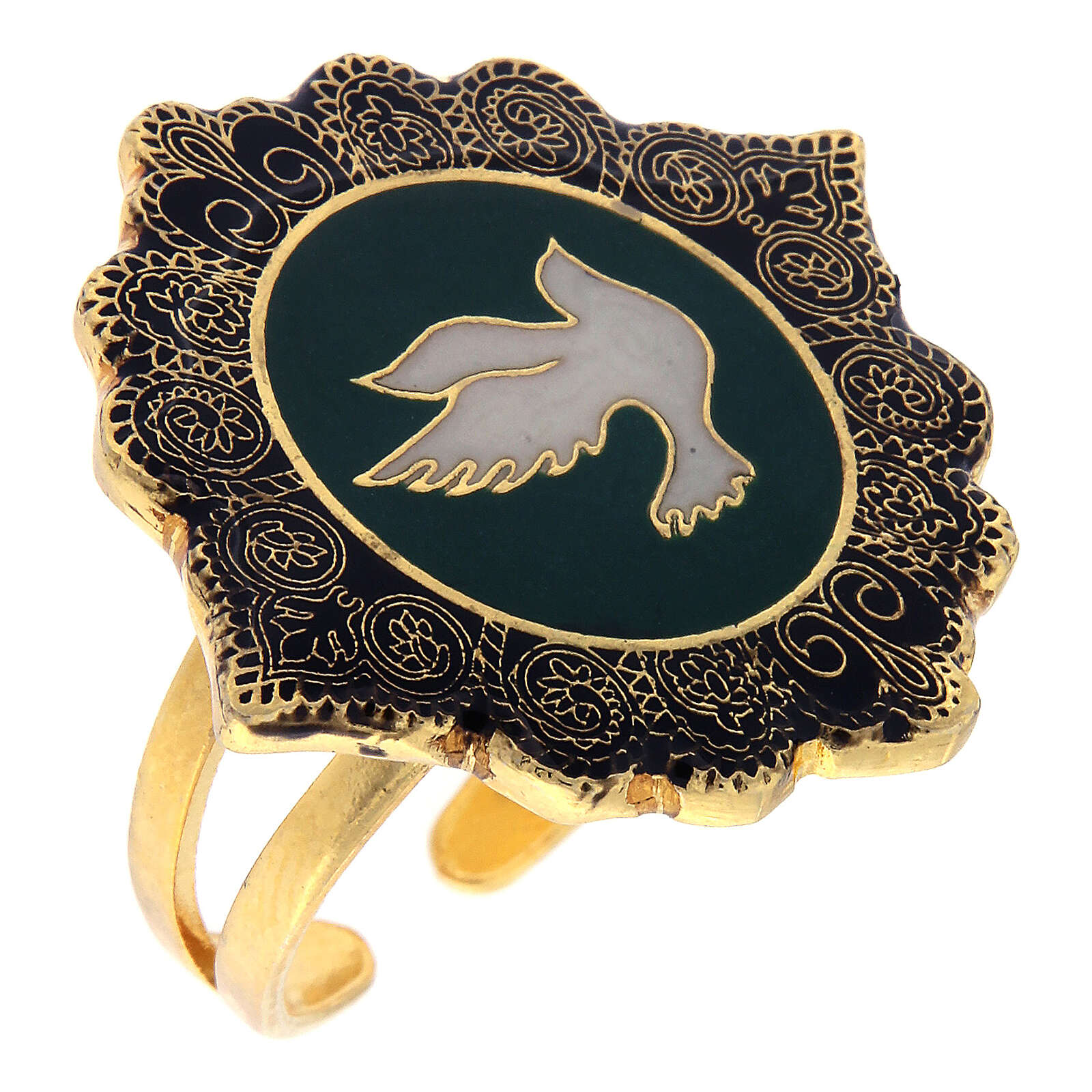 Bague colombe de la paix fond vert taille réglable. Bague réglable de 15 à 18 mm (diamètre interne de départ : 17 mm) en métal avec finition galvanique doré sans nickel complété par une médaille en zamak de 2,5x2,7 cm. Cette dernière représente une colombe blanche émaillée à la main sur un fond vert.