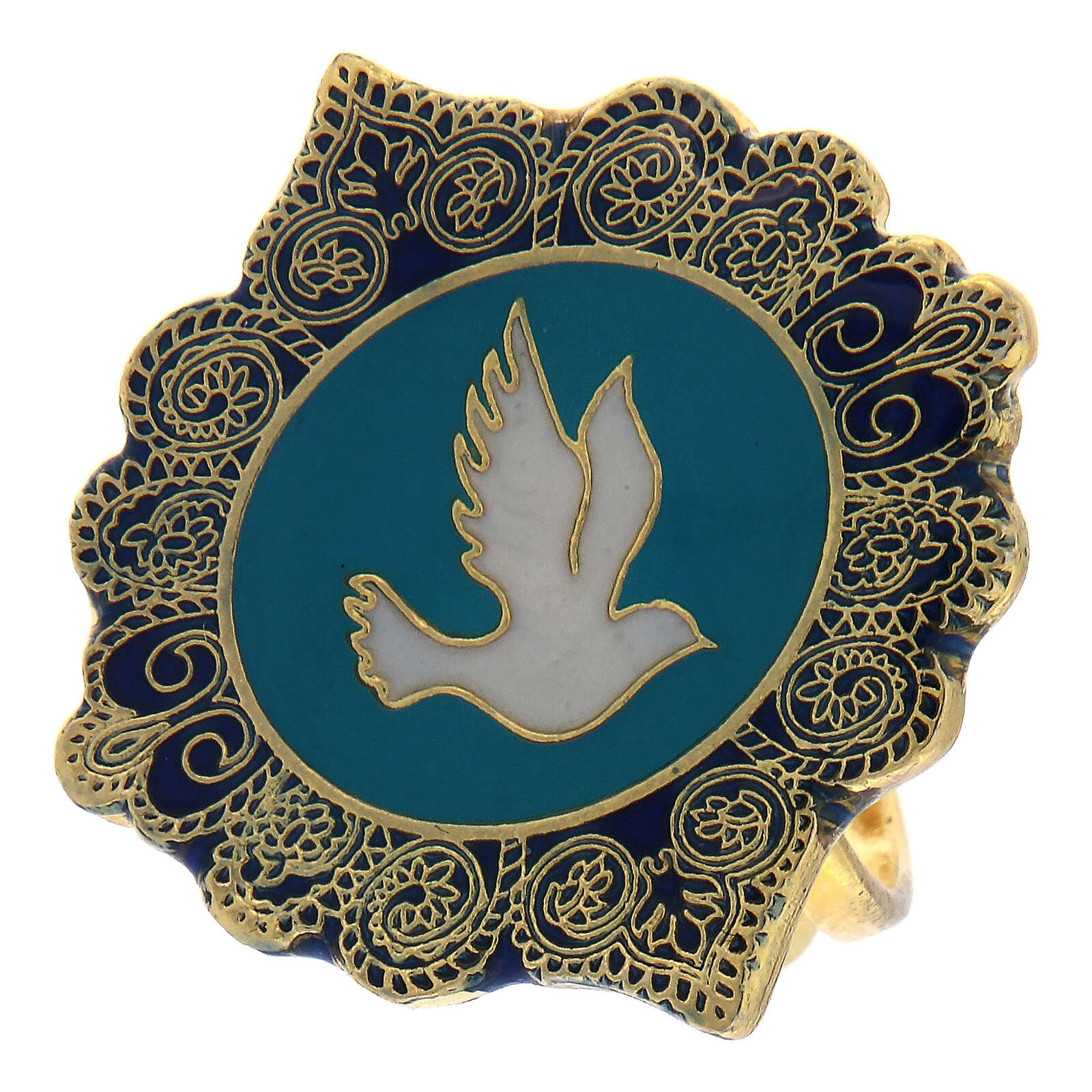 Bague colombe de la paix turquoise taille réglable. Bague réglable de 15 à 18 mm (diamètre interne de départ : 17 mm) en métal avec finition galvanique doré sans nickel complété par une médaille en zamak de 2,5x2,7 cm. Cette dernière représente une colombe blanche émaillée à la main sur un fond couleur turquoise.