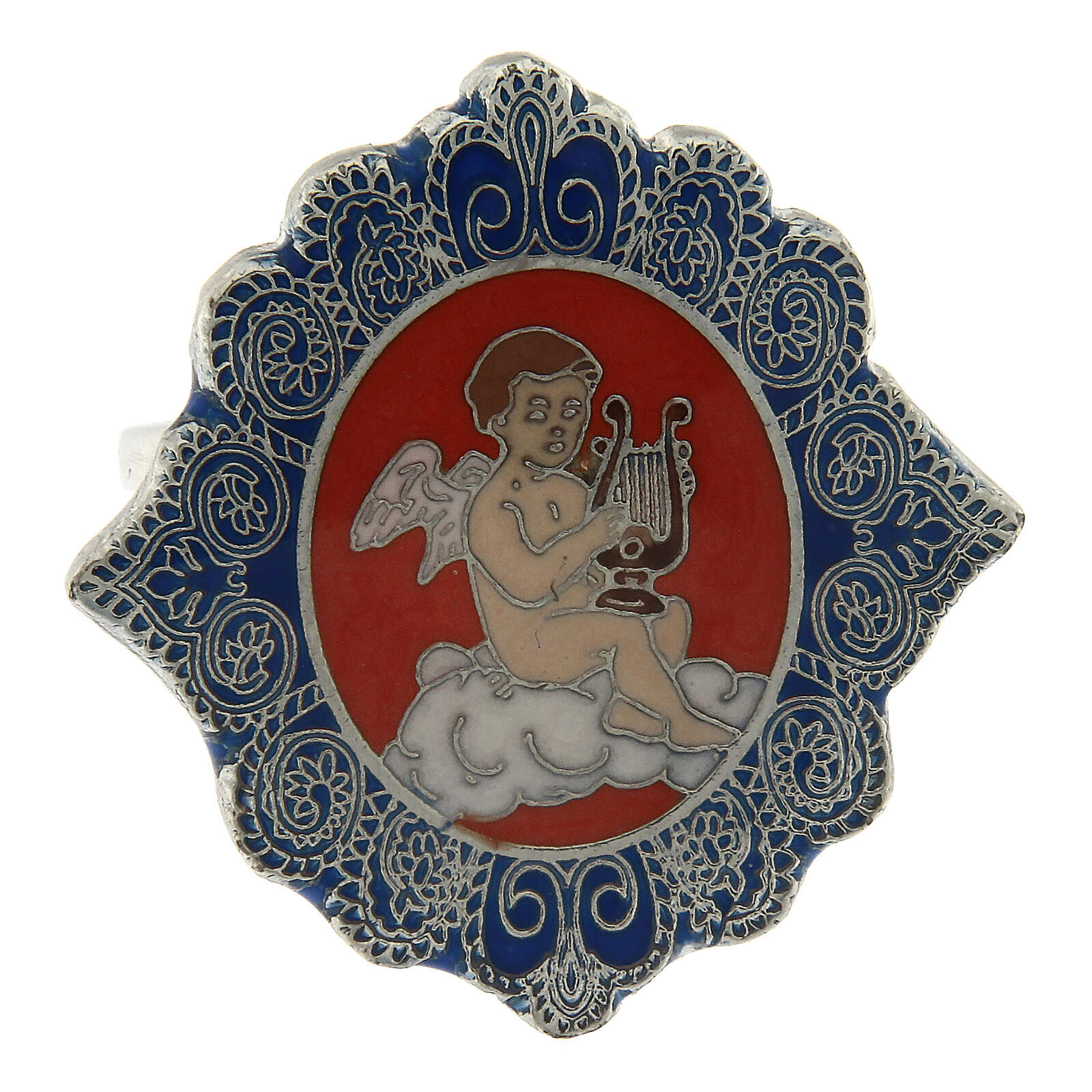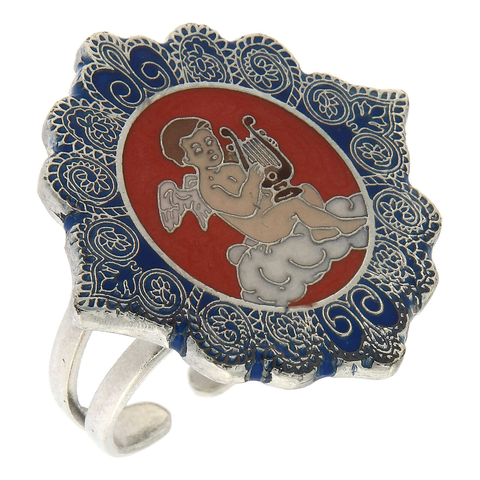 Bague réglable Ange musicien fond corail. Bague en métal avec médaille en zamak avec finition galvanique en bronze blanc sans nickel. La médaille d'ange musicien de 2,5x2,5 cm avec fond corail et bord bleu est émaillée à la main avec une seringue pour offrir une image très détaillée. L'émail est ensuite cuit et recouvert d'une couche de protection en résine transparente pour en exalter l'éclat.
