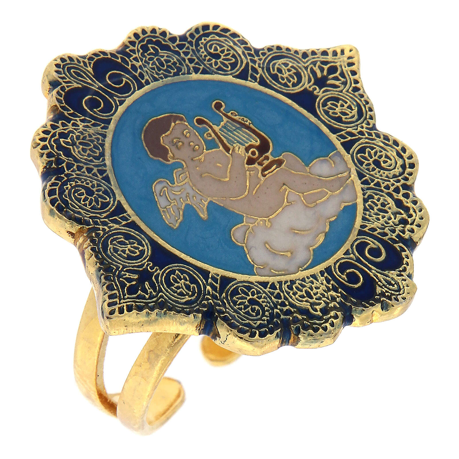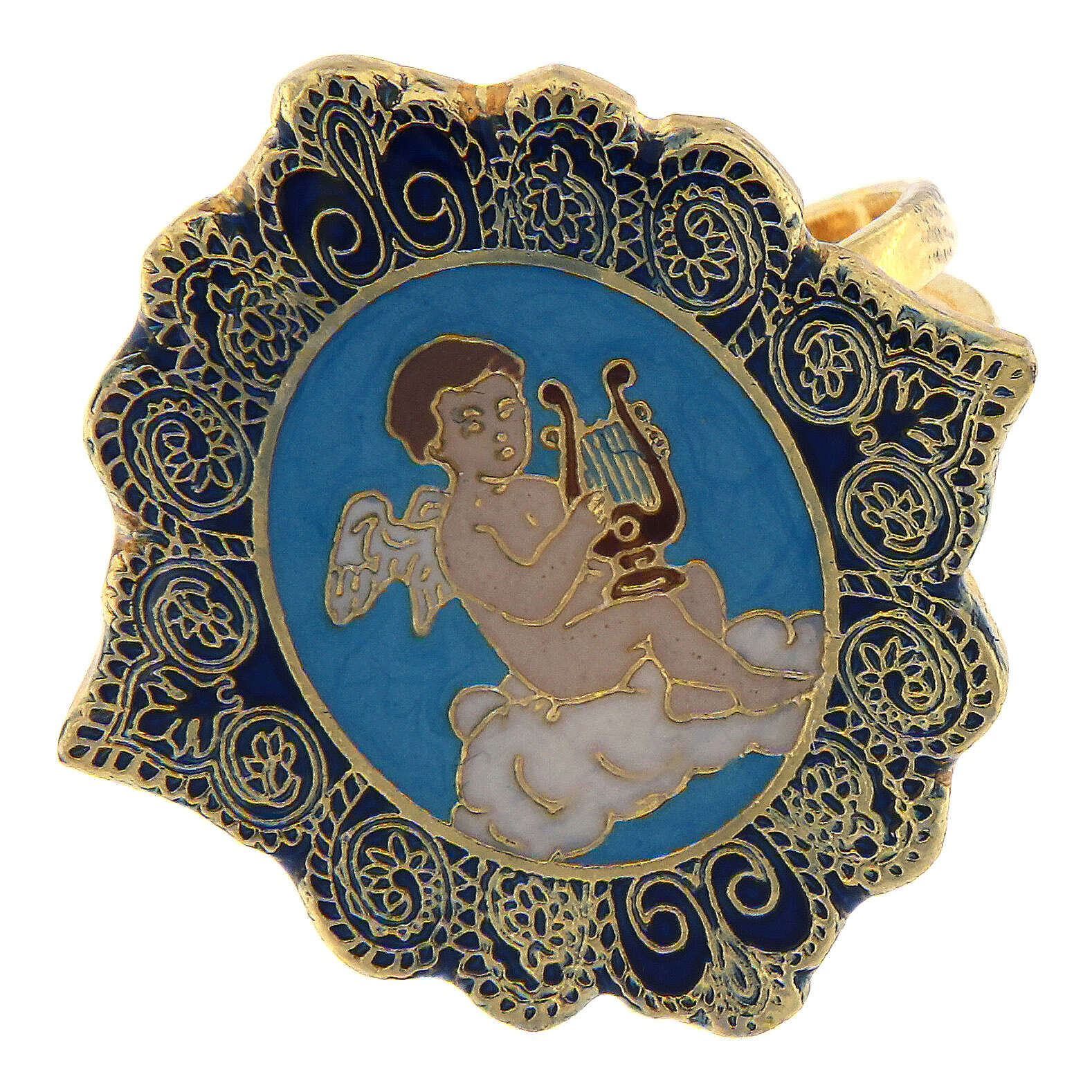 Bague réglable Ange musicien turquoise. Bague en métal avec médaille en zamak avec finition galvanique en bronze blanc sans nickel. La médaille d'ange musicien de 2,5x2,5 cm avec fond turquoise et bord bleu est émaillée à la main avec une seringue pour offrir une image très détaillée. L'émail est ensuite cuit et recouvert d'une couche de protection en résine transparente pour en exalter l'éclat.