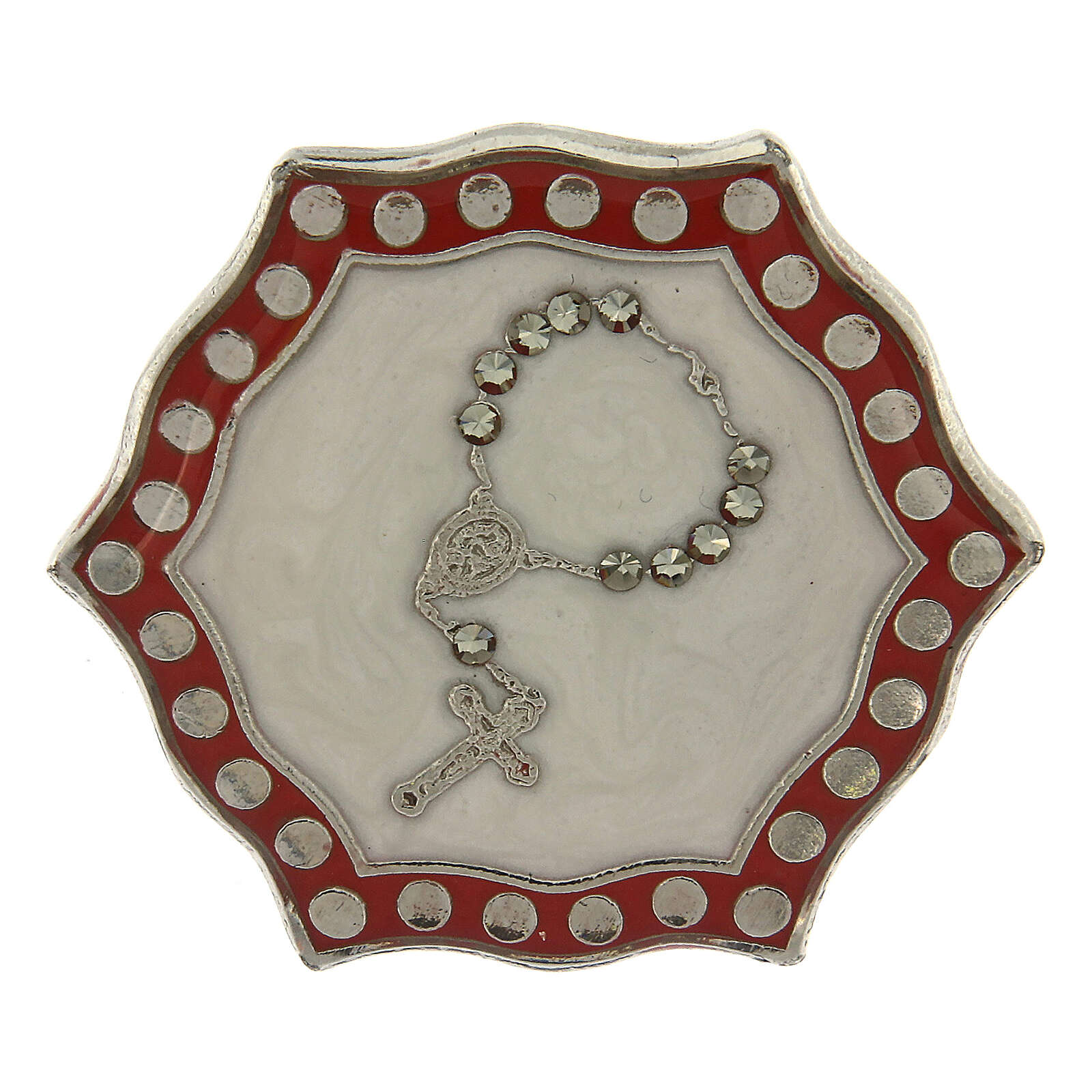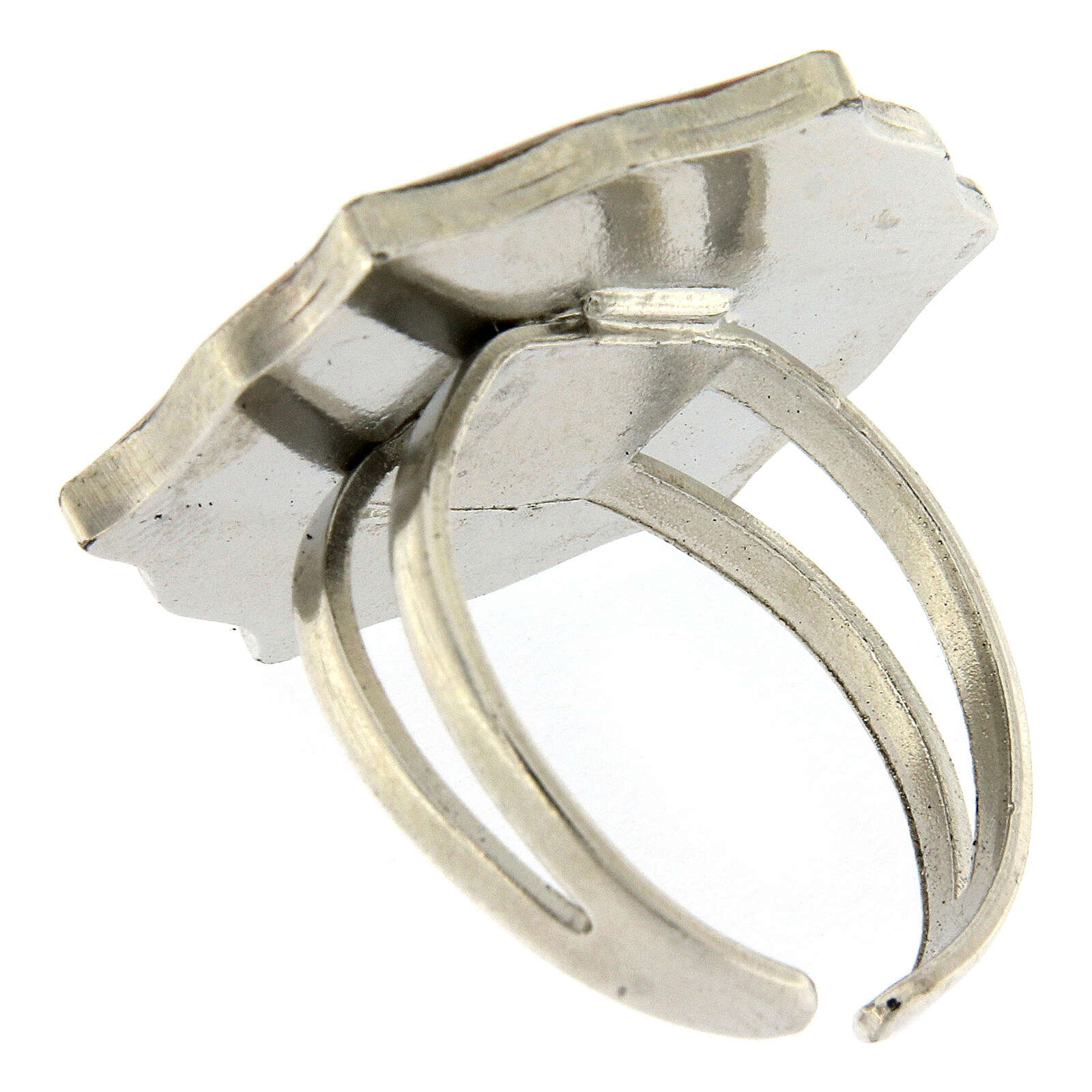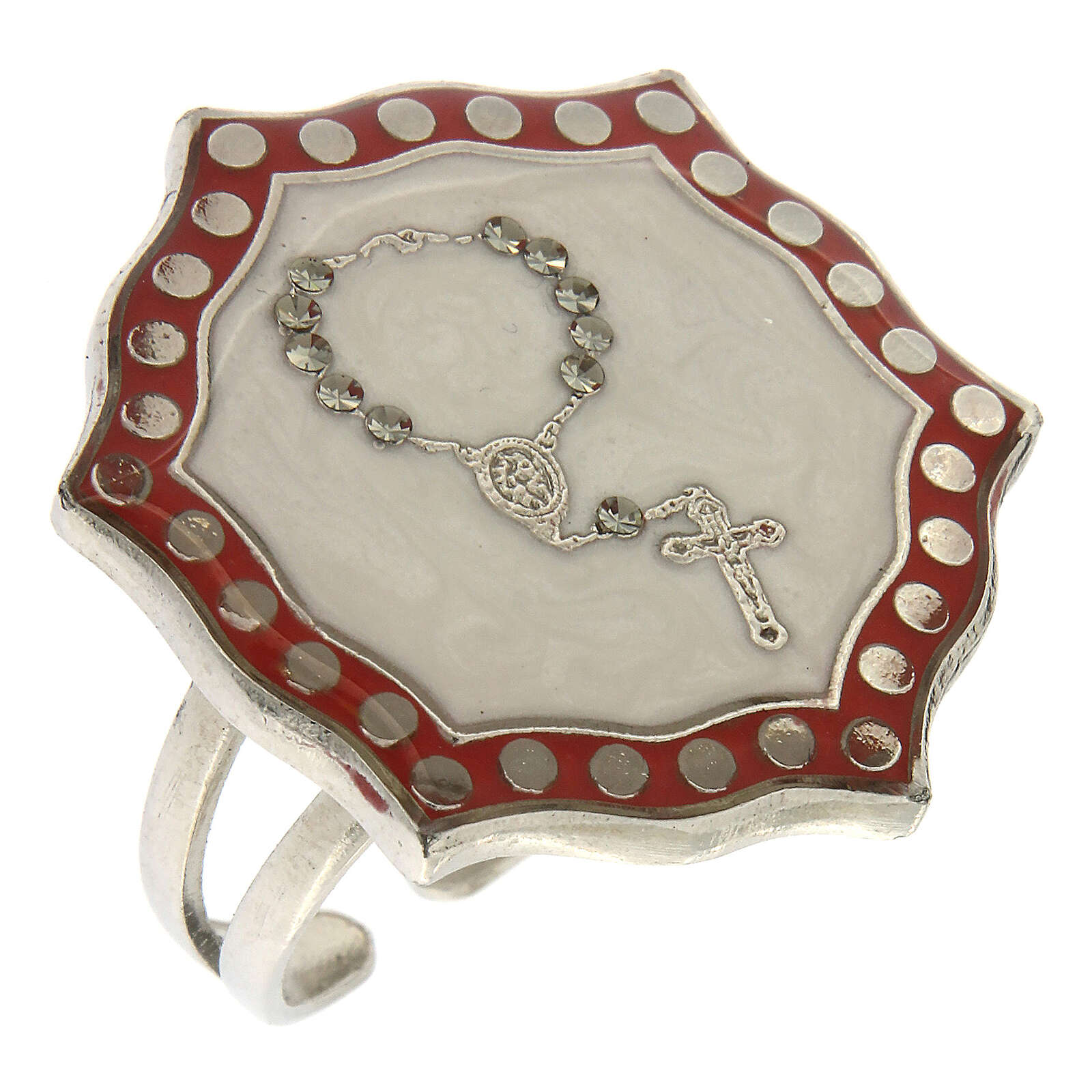 Bague réglable Chapelet dizainier en strass nacré. Bague en métal avec finition galvanique en bronze blanc sans nickel et image de chapelet dizainier sur médaille en zamak émaillé couleur nacre décoré de strass Swarovski.