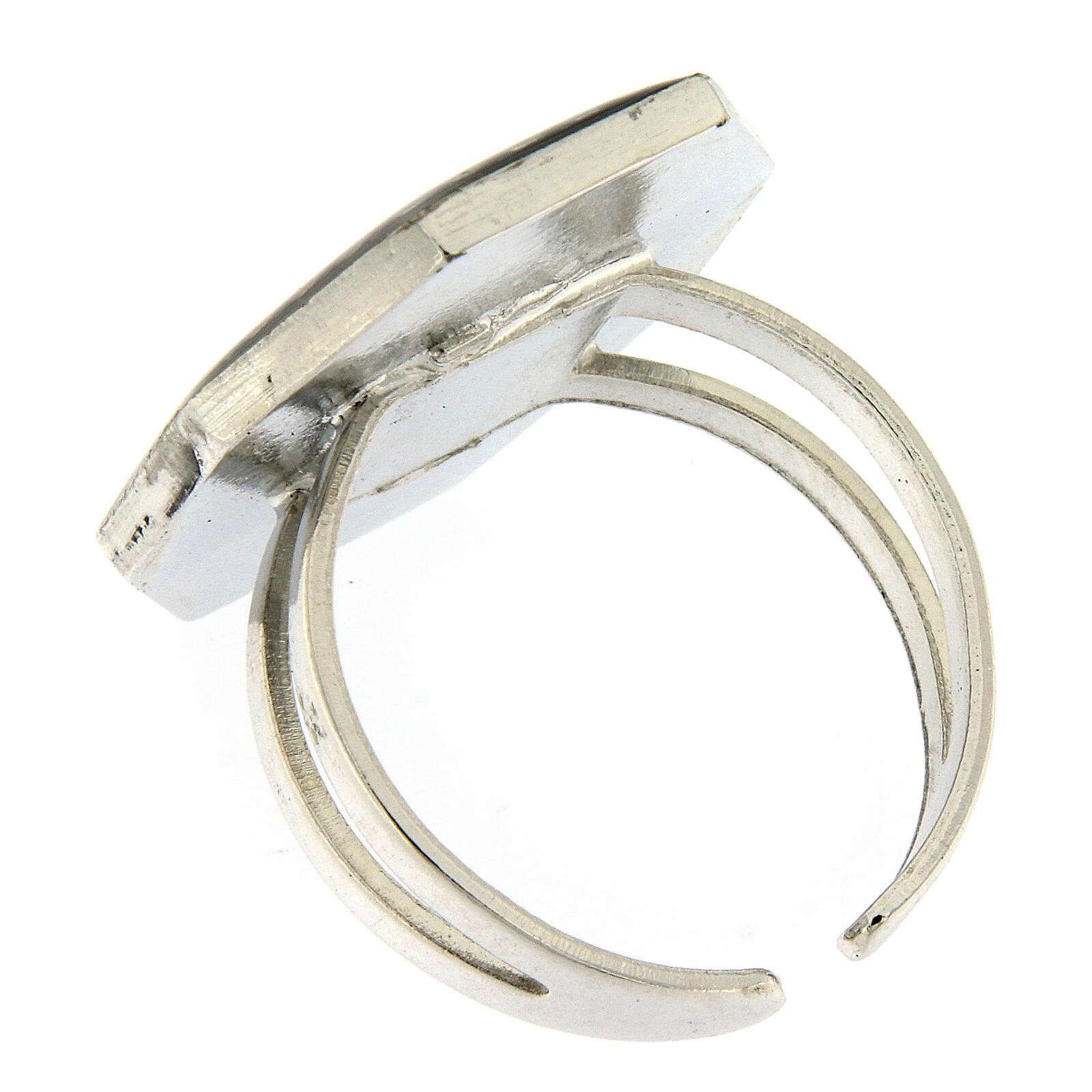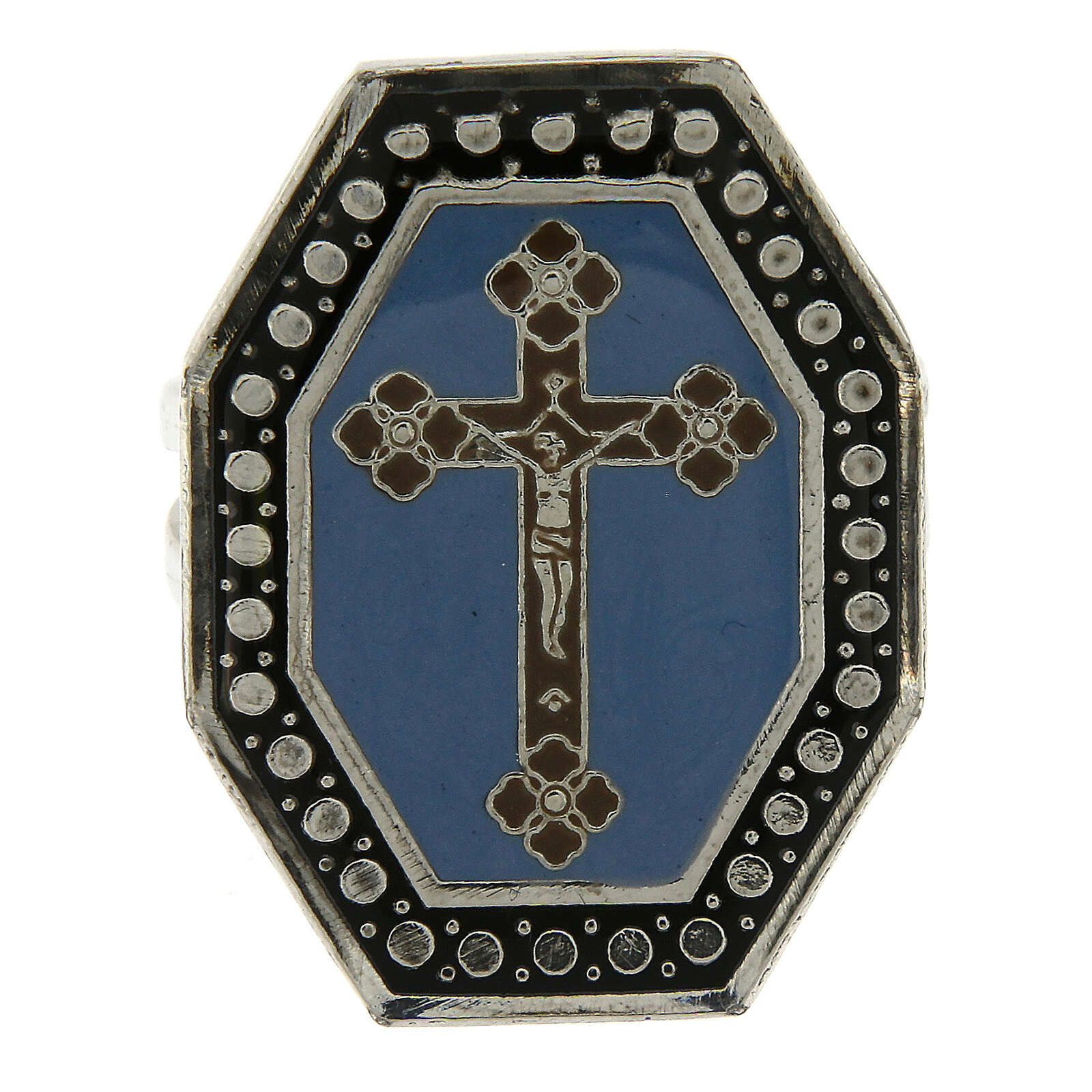 Bague réglable Croix indigo. Bague avec Croix sur fond couleur indigo émaillé, réalisée en métal avec médaille en zamak et finie avec bain galvanique en bronze blanc sans nickel.